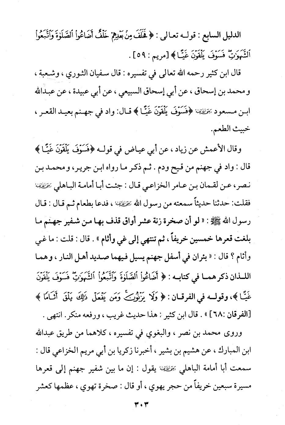 ثم ذكر ما رواه ابن جرير، ومحمد بن نصر، عن لقمان بن عامر الخزاعي قال: جئت أبا أمامة الباهلي - رضي الله عنه - فقلت: حدثنا حديثا سمعته من رسول الله - صلى الله عليه وسلم -، فدعا بطعام ثم قال: قال رسول الله - صلى الله عليه وسلم -: «لو أن صخرة زِنَة عشر أواق قذف بها من شفير جهنم ما بلغت قعرها خمسين خريفا، ثم تنتهي إلى غي وأثام»، قال: قلت: ما غي وأثام؟ قال: «بئران في أسفل جهنم يسيل فيهما صديد أهل النار، وهما اللذان ذكرهما في كتابه: {أَضَاعُوا الصَّلَاةَ وَاتَّبَعُوا الشَّهَوَاتِ فَسَوْفَ يَلْقَوْنَ غَيًّا}، وقوله في الفرقان: {ولَا يَزْنُونَ وَمَنْ يَفْعَلْ ذَلِكَ يَلْقَ أَثَامًا} [الفرقان: 68]» قال ابن كثير: هذا حديث غريب، ورفعه منكر. انتهى.