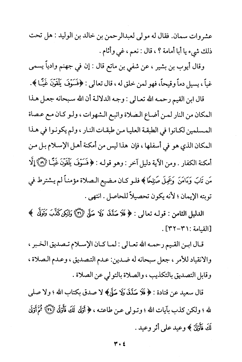 قال ابن القيم رحمه الله تعالى: وجه الدلالة أن الله سبحانه جعل هذا المكان من النار لمن أضاع الصلاة واتبع الشهوات، ولو كان مع عصاة المسلمين لكانوا في الطبقة العليا من طبقات النار، ولم يكونوا في هذا المكان الذي هو في أسفلها، فإن هذا ليس من أمكنة أهل الإسلام بل من أمكنة الكفار، ومن الآية دليل آخر؛ وهو قوله: {فَسَوْفَ يَلْقَوْنَ غَيًّا * إِلَّا مَنْ تَابَ وَآَمَنَ وَعَمِلَ صَالِحًا} فلو كان مضيع الصلاة مؤمنا لم يشترط في توبته الإيمان؛ لأنه يكون تحصيلا للحاصل. انتهى.