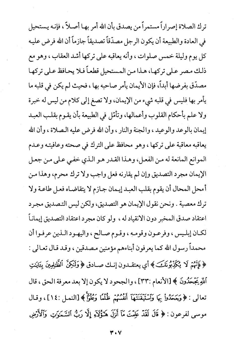 ترك الصلاة إصرارا مستمرا من يصدق بأن الله أمر بها أصلا، فإنه يستحيل في العادة والطبيعة أن يكون الرجل مصدقا تصديقا جازما أن الله فرض عليه كل يوم وليلة خمس صلوات، وأنه يعاقبه على تركها أشد العقاب، وهو مع ذلك مُصِرّ على تركها، هذا من المستحيل قطعا فلا يحافظ على تركها مصدق بفرضها أبدا، فإن الإيمان يأمر صاحبه بها، فحيث لم يكن في قلبه ما يأمر بها فليس في قلبه شيء من الإيمان، ولا تصغ إلى كلام من ليس له خبرة ولا علم بأحكام القلوب وأعمالها، وتأمل في الطبيعة بأن يقوم بقلب العبد إيمان بالوعد والوعيد، والجنة والنار، وأن الله فرض عليه الصلاة، وأن الله يعاقبه معاقبة على تركها، وهو محافظ على الترك في صحته وعافيته وعدم الموانع المانعة له من الفعل، وهذا القدر هو الذي خفي على من جعل الإيمان مجرد التصديق وإن لم يقارنه فعل واجب ولا ترك محرم، وهذا من أمحل المحال أن يقوم بقلب العبد إيمان جازم لا يتقاضاه فعل طاعة ولا ترك معصية، ونحن نقول الإيمان هو التصديق، ولكن ليس التصديق مجرد اعتقاد صدق المخبر دون الانقياد له، ولو كان مجرد اعتقاد التصديق إيمانا لكان إبليس، وفرعون وقومه، وقوم صالح، واليهود الذين عرفوا أن محمدا رسول الله كما يعرفون أبناءهم مؤمنين مصدقين، وقد قال تعالى: {فَإِنَّهُمْ لَا يُكَذِّبُونَكَ} أي يعتقدون إنك صادق {وَلَكِنَّ الظَّالِمِينَ بِآَيَاتِ اللَّهِ يَجْحَدُونَ} [الأنعام: 33]، والجحود لا يكون إلا بعد معرفة الحق، قال تعالى: {وَجَحَدُوا بِهَا وَاسْتَيْقَنَتْهَا أَنْفُسُهُمْ ظُلْمًا وَعُلُوًّا} [النمل: 14]، وقال موسى لفرعون: {قَالَ لَقَدْ عَلِمْتَ مَا أَنْزَلَ هَؤُلَاءِ إِلَّا رَبُّ السَّمَاوَاتِ وَالْأَرْضِ