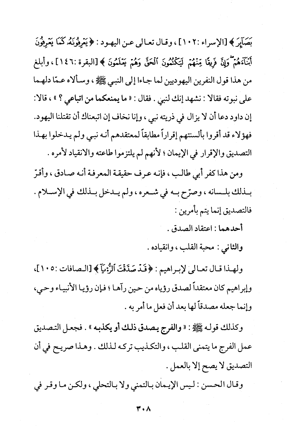 بَصَائِرَ} [الإسراء: 102]، وقال تعالى عن اليهود: {يَعْرِفُونَهُ كَمَا يَعْرِفُونَ أَبْنَاءَهُمْ وَإِنَّ فَرِيقًا مِنْهُمْ لَيَكْتُمُونَ الْحَقَّ وَهُمْ يَعْلَمُونَ} [البقرة: 146]، وأبلغ من هذا قول النفرين اليهوديين لما جاءا إلى النبي - صلى الله عليه وسلم -، وسألاه عما دلهما على نبوته فقالا: نشهد أنك لنبي، فقال: «ما يمنعكما من اتباعي؟» قالا: إن داود دعا أن لا يزال في ذريته نبي، وإنا نخاف إن اتبعناك أن تقتلنا اليهود. فهؤلاء قد أقروا بألسنتهم إقرارا مطابقا لمعتقدهم أنه نبي، ولم يدخلوا بهذا التصديق والإقرار في الإيمان؛ لأنهم لم يلتزموا طاعته والانقياد لأمره.
