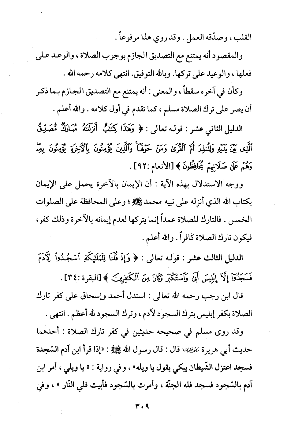 وقد روى مسلم في صحيحه حديثين في كفر تارك الصلاة؛ أحدهما حديث أبي هريرة - رضي الله عنه - قال: قال رسول الله - صلى الله عليه وسلم -: «إذا قرأ ابن آدم السجدة فسجد اعتزل الشيطان يبكي يقول يا ويله»، وفي رواية: «يا ويلي، أُمر ابن آدم بالسجود فسجد فله الجنة، وأمرت بالسجود فأبيت فلي النار»، وفي