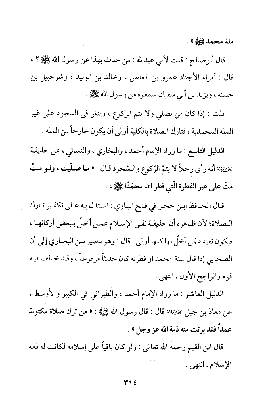 الدليل التاسع: ما رواه الإمام أحمد، والبخاري، والنسائي، عن حذيفة - رضي الله عنه - أنه رأى رجلا لا يتم الركوع والسجود قال: «ما صليت، ولو متّ متّ على غير الفطرة التي فطر الله محمد - صلى الله عليه وسلم -».