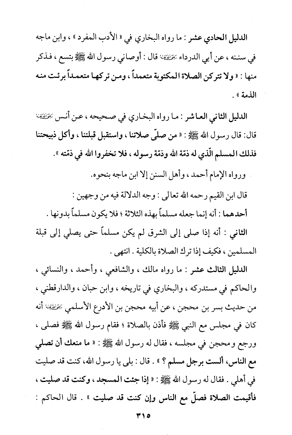 الدليل الحادي عشر: ما رواه البخاري في "الأدب المفرد"، وابن ماجة في سننه، عن أبي الدرداء - رضي الله عنه - قال: أوصاني رسول الله - صلى الله عليه وسلم - بتسع؛ فذكر منها: «ولا تتركن الصلاة المكتوبة متعمدا، ومن تركها متعمدا برئت منه الذمة».