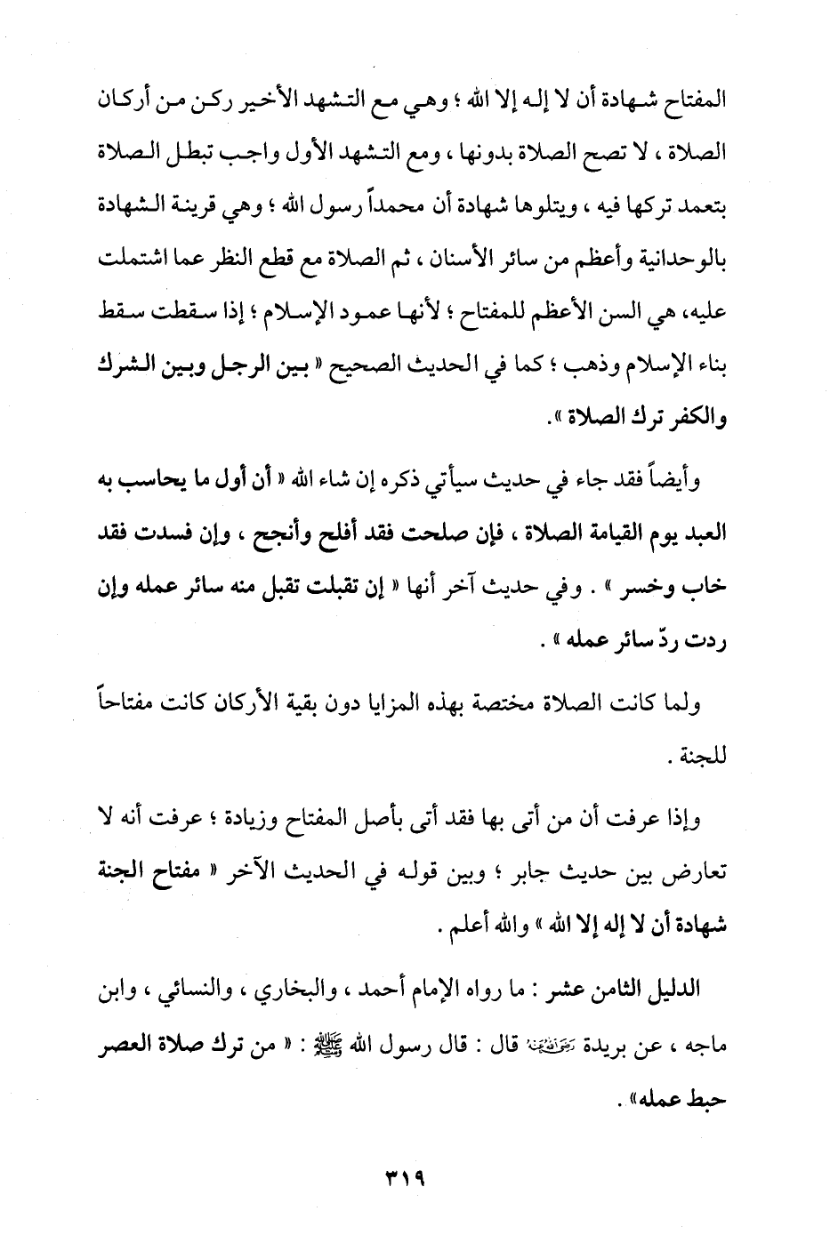 الدليل الثامن عشر: ما رواه الإمام أحمد، والبخاري، والنسائي، وابن ماجة، عن بريدة - رضي الله عنه - قال: قال رسول الله - صلى الله عليه وسلم -: «من ترك صلاة العصر حبط عمله».