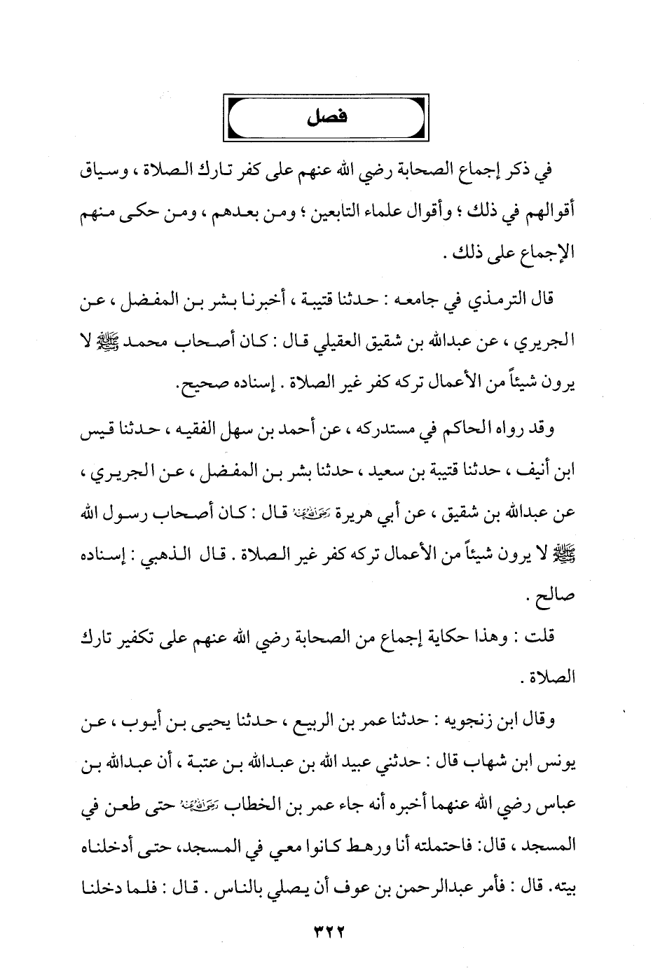 قال الترمذي في جامعه: حدثنا قتيبة، أخبرنا بشر بن المفضل، عن الجريري، عن عبد الله بن شقيق العقيلي قال: كان أصحاب محمد - صلى الله عليه وسلم - لا يرون شيئا من الأعمال تركه كفر غير الصلاة. إسناده صحيح.