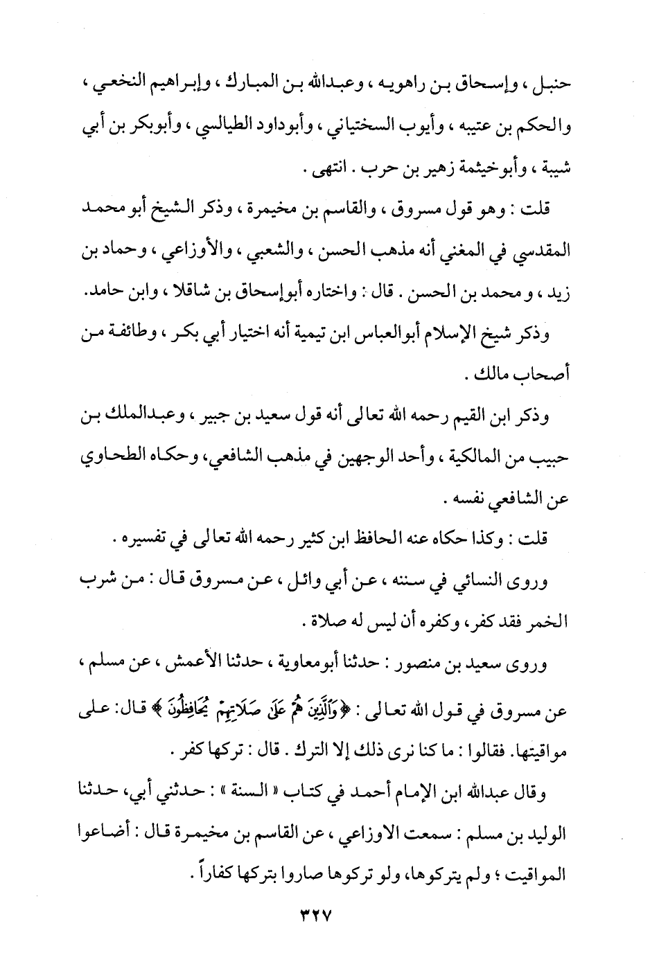وروى سعيد بن منصور: حدثنا أبو معاوية، حدثنا الأعمش، عن مسلم، عن مسروق في قول الله تعالى: {وَالَّذِينَ هُمْ عَلَى صَلَاتِهِمْ يُحَافِظُونَ} قال: على مواقيتها، فقالوا: ما كنا نرى ذلك إلا الترك، قال: تركها كفر.
