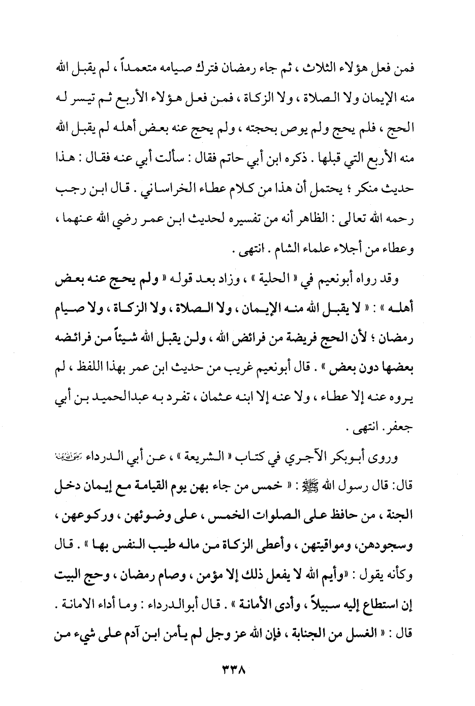 وروى أبو بكر الآجري في كتاب "الشريعة"، عن أبي الدرداء - رضي الله عنه - قال: قال رسول الله - صلى الله عليه وسلم -: «خمس من جاء بهن يوم القيامة مع إيمان دخل الجنة؛ من حافظ على الصلوات الخمس؛ على وضوئهن، وركوعهن، وسجودهن، ومواقيتهن، وأعطى الزكاة من ماله طيب النفس بها» قال وكأنه يقول: «وأيم الله لا يفعل ذلك إلا مؤمن، وصام رمضان، وحج البيت إن استطاع إليه سبيلا، وأدى الأمانة» قال أبو الدرداء: وما أداء الأمانة؟ قال: «الغسل من الجنابة، فإن الله عز وجل لم يأمن ابن آدم على شيء من