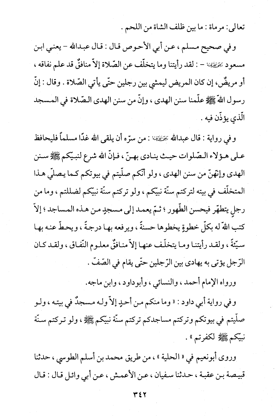 وفي رواية: قال عبد الله - رضي الله عنه -: من سره أن يلقى الله غدا مسلما فليحافظ على هؤلاء الصلوات حيث ينادى بهن، فإن الله شرع لنبيكم - صلى الله عليه وسلم - سنن الهدى وإنهن من سنن الهدى، ولو أنكم صليتم في بيوتكم كما يصلي هذا المتخلف في بيته لتركتم سنة نبيكم، ولو تركتم سنة نبيكم لضللتم، وما من رجل يتطهر فيحسن الطهور ثم يعمد إلى مسجد من هذه المساجد إلا كتب الله له بكل خطوة يخطوها حسنة، ويرفعه بها درجة، ويحط عنه بها سيئة، ولقد رأيتنا وما يتخلف عنها إلا منافق معلوم النفاق، ولقد كان الرجل يؤتى به يهادي بين الرجلين حتى يقام في الصف.