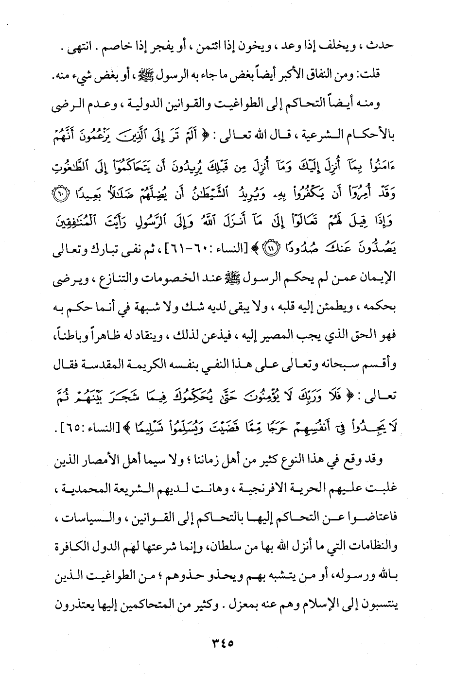 ومنه أيضا التحاكم إلى الطواغيت والقوانين الدولية، وعدم الرضى بالأحكام الشرعية، قال الله تعالى: {أَلَمْ تَرَ إِلَى الَّذِينَ يَزْعُمُونَ أَنَّهُمْ آَمَنُوا بِمَا أُنْزِلَ إِلَيْكَ وَمَا أُنْزِلَ مِنْ قَبْلِكَ يُرِيدُونَ أَنْ يَتَحَاكَمُوا إِلَى الطَّاغُوتِ وَقَدْ أُمِرُوا أَنْ يَكْفُرُوا بِهِ وَيُرِيدُ الشَّيْطَانُ أَنْ يُضِلَّهُمْ ضَلَالًا بَعِيدًا * وَإِذَا قِيلَ لَهُمْ تَعَالَوْا إِلَى مَا أَنْزَلَ اللَّهُ وَإِلَى الرَّسُولِ رَأَيْتَ الْمُنَافِقِينَ يَصُدُّونَ عَنْكَ صُدُودًا} [النساء: 60 - 61]، ثم نفى تبارك وتعالى الإيمان عمن لم يحكم الرسول - صلى الله عليه وسلم - عند الخصومات والتنازع، ويرضى بحكمه، ويطمئن إليه قلبه، ولا يبقى لديه شك ولا شبهة في أنما حكم به فهو الحق الذي يجب المصير إليه، فيذعن لذلك، وينقاد له ظاهرا وباطنا، وأقسم سبحانه وتعالى على هذا النفي بنفسه الكريمة المقدسة فقال تعالى: {فَلَا وَرَبِّكَ لَا يُؤْمِنُونَ حَتَّى يُحَكِّمُوكَ فِيمَا شَجَرَ بَيْنَهُمْ ثُمَّ لَا يَجِدُوا فِي أَنْفُسِهِمْ حَرَجًا مِمَّا قَضَيْتَ وَيُسَلِّمُوا تَسْلِيمًا} [النساء: 65].