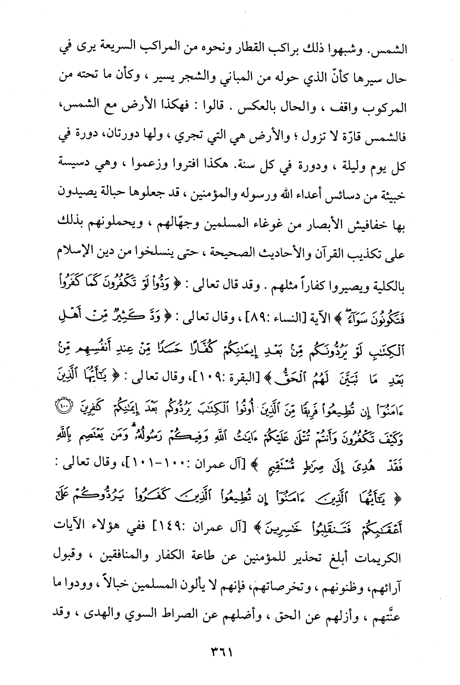 الشمس، وشبهوا ذلك براكب القطار ونحوه من المراكب السريعة يرى في حال سيرها كأن الذي حوله من المباني والشجر يسير، وكأن ما تحته من المركوب واقف، والحال بالعكس، قالوا: فهكذا الأرض مع الشمس، فالشمس قارة لا تزول، والأرض هي التي تجري، ولها دورتان، دورة في كل يوم وليلة، ودورة في كل سنة، هكذا افتروا وزعموا، وهي دسيسة خبيثة من دسائس أعداء الله ورسوله والمؤمنين، قد جعلوها حبالة يصيدون بها خفافيش الأبصار من غوغاء المسلمين وجُهَّالهم، ويحملونهم بذلك على تكذيب القرآن والأحاديث الصحيحة، حتى ينسلخوا من دين الإسلام بالكلية ويصيروا كفارا مثلهم، وقد قال تعالى: {وَدُّوا لَوْ تَكْفُرُونَ كَمَا كَفَرُوا فَتَكُونُونَ سَوَاءً} الآية [النساء: 89]، وقال تعالى: {وَدَّ كَثِيرٌ مِنْ أَهْلِ الْكِتَابِ لَوْ يَرُدُّونَكُمْ مِنْ بَعْدِ إِيمَانِكُمْ كُفَّارًا حَسَدًا مِنْ عِنْدِ أَنْفُسِهِمْ مِنْ بَعْدِ مَا تَبَيَّنَ لَهُمُ الْحَقُّ} [البقرة: 109]، وقال تعالى: {يَا أَيُّهَا الَّذِينَ آَمَنُوا إِنْ تُطِيعُوا فَرِيقًا مِنَ الَّذِينَ أُوتُوا الْكِتَابَ يَرُدُّوكُمْ بَعْدَ إِيمَانِكُمْ كَافِرِينَ * وَكَيْفَ تَكْفُرُونَ وَأَنْتُمْ تُتْلَى عَلَيْكُمْ آَيَاتُ اللَّهِ وَفِيكُمْ رَسُولُهُ وَمَنْ يَعْتَصِمْ بِاللَّهِ فَقَدْ هُدِيَ إِلَى صِرَاطٍ مُسْتَقِيمٍ} [آل عمران: 100 - 101]، وقال تعالى: {يَا أَيُّهَا الَّذِينَ آَمَنُوا إِنْ تُطِيعُوا الَّذِينَ كَفَرُوا يَرُدُّوكُمْ عَلَى أَعْقَابِكُمْ فَتَنْقَلِبُوا خَاسِرِينَ} [آل عمران: 149]، ففي هؤلاء الآيات الكريمات أبلغ تحذير للمؤمنين من طاعة الكفار والمنافقين، وقبول آرائهم وظنونهم وتخرصاتهم، فإنهم لا يألون المسلمين خبالا، وودوا ما عنَّتهم، وأزلَّهم عن الحق، وأضلهم عن الصراط السوي والهدى، وقد