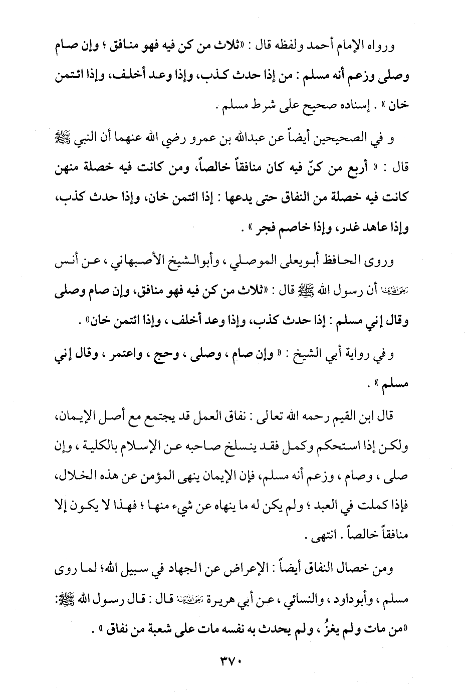 ورواه الإمام أحمد ولفظه قال: «ثلاث من كُنَّ فيه فهو منافق، وإن صام وصلى وزعم أنه مسلم: من إذا حدّث كذب، وإذا وعد أخلف، وإذا اؤتمن خان» إسناده صحيح على شرط مسلم.