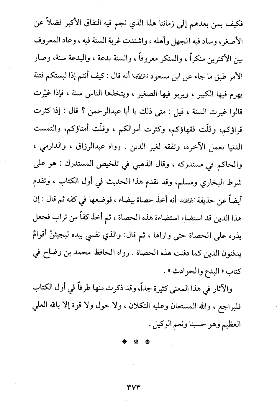 فكيف بمن بعدهم إلى زماننا هذا الذي نجم فيه النفاق الأكبر فضلا عن الأصغر، وساد فيه الجهل وأهله، واشتدت غربة السُنَّة فيه، وعاد المعروف بين الأكثرين منكرا، والمنكر معروفا، والسنة بدعة، والبدعة سنة، وصار الأمر طبق ما جاء عن ابن مسعود - رضي الله عنه - أنه قال: «كيف أنتم إذا لبستكم فتنة يهرم فيها الكبير، ويربو فيها الصغير، ويتخذها الناس سُنَّة، فإذا غُيِّرت قالوا: غُيِّرت السنة» قيل: متى ذلك يا أبا عبد الرحمن؟ قال: «إذا كثرت قُراؤكم، وقلت فقهاؤكم، وكثرت أموالكم، وقلت أمناؤكم، والتمست الدنيا بعمل الآخرة، وتفقه لغير الدين» رواه عبد الرزاق، والدارمي، والحاكم في مستدركه، وقال الذهبي في تلخيص المستدرك: هو على شرط البخاري ومسلم، وقد تقدم هذا الحديث في أول الكتاب، وتقدم أيضا عن حذيفة - رضي الله عنه - أنه أخذ حصاة بيضاء، فوضعها في كفة ثم قال: إن هذا الدين قد استضاء استضاءة هذه الحصاة، ثم أخذ كفا من تراب فجعل يذره على الحصاة حتى واراها، ثم قال: والذي نفسي بيده ليجيئن أقوام يدفنون الدين كما دفنت هذه الحصاة. رواه الحافظ محمد بن وضاح في كتاب "البدع والحوادث".