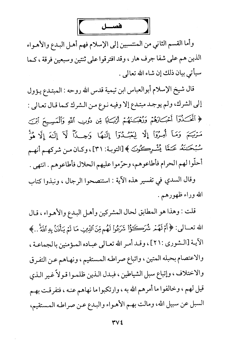 قال شيخ الإسلام أبو العباس ابن تيمية قدس الله روحه: المبتدع يؤول إلى الشرك، ولم يوجد مبتدع إلا وفيه نوع من الشرك كما قال تعالى: {اتَّخَذُوا أَحْبَارَهُمْ وَرُهْبَانَهُمْ أَرْبَابًا مِنْ دُونِ اللَّهِ وَالْمَسِيحَ ابْنَ مَرْيَمَ وَمَا أُمِرُوا إِلَّا لِيَعْبُدُوا إِلَهًا وَاحِدًا لَا إِلَهَ إِلَّا هُوَ سُبْحَانَهُ عَمَّا يُشْرِكُونَ} [التوبة: 31]، وكان من شركهم أنهم أحلوا لهم الحرام فأطاعوهم، وحرموا عليهم الحلال فأطاعوهم. انتهى.