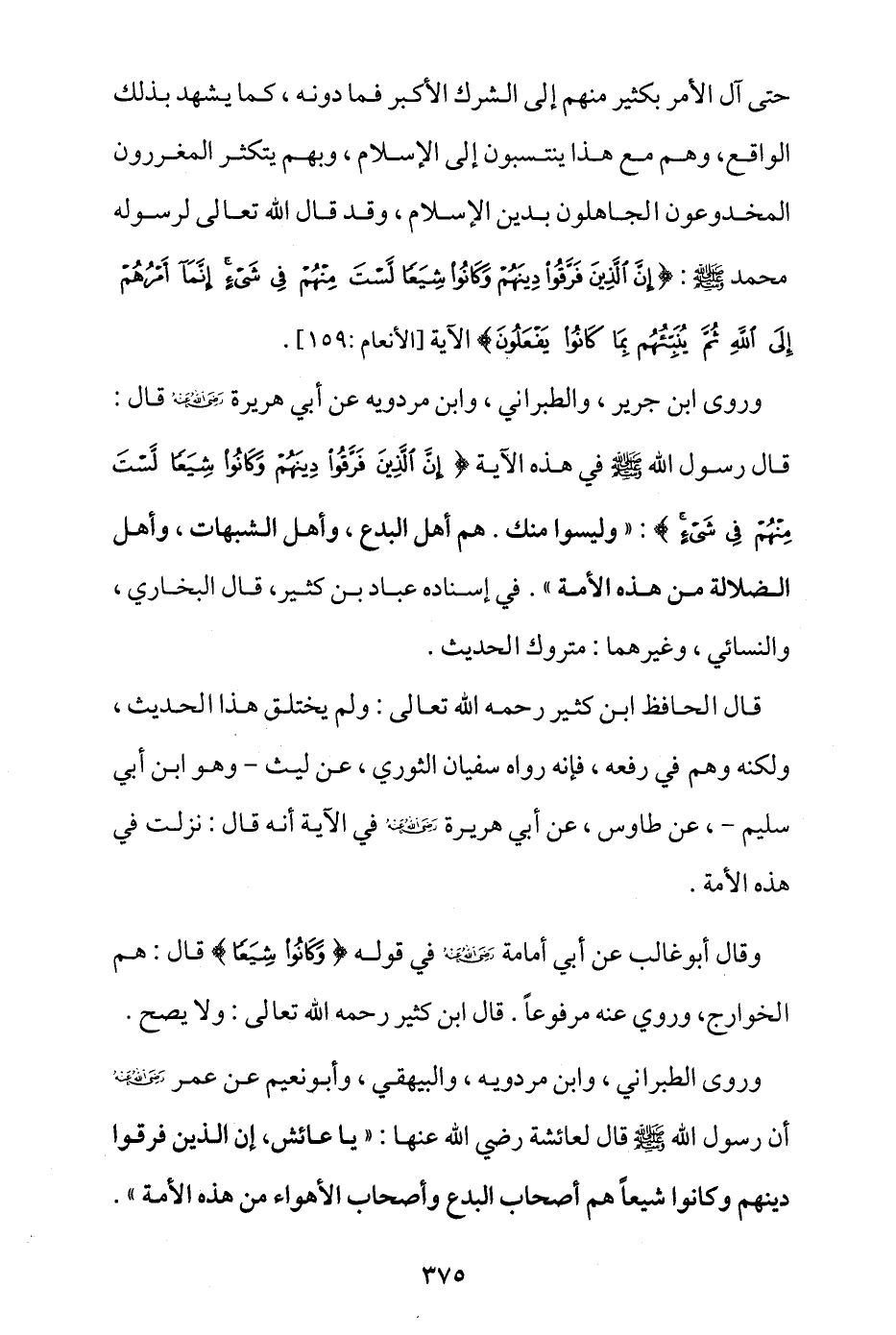 وروى ابن جرير، والطبراني، وابن مردويه عن أبي هريرة - رضي الله عنه - قال: قال رسول الله - صلى الله عليه وسلم - في هذه الآية {إِنَّ الَّذِينَ فَرَّقُوا دِينَهُمْ وَكَانُوا شِيَعًا لَسْتَ مِنْهُمْ فِي شَيْءٍ}: «وليسوا منك؛ هم أهل البدع، وأهل الشبهات، وأهل الضلال من هذه الأمة» في إسناده عباد بن كثير، قال البخاري والنسائي وغيرهما: متروك الحديث.