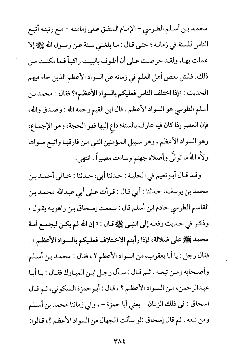 محمد بن أسلم الطوسي -الإمام المتفق على إمامته- مع رتبته أتبع الناس للسنة في زمانه، حتى قال: ما بلغني سنة عن رسول الله - صلى الله عليه وسلم - إلا عملت بها، ولقد حرصت على أن أطوف بالبيت راكبا فما مُكِّنت من ذلك. فسُئل بعض أهل العلم في زمانه عن السواد الأعظم الذين جاء فيهم الحديث: «إذا اختلف الناس فعليكم بالسواد الأعظم» فقال: محمد بن أسلم الطوسي هو السواد الأعظم. قال ابن القيم رحمه الله: وصدق والله، فإن العصر إذا كان فيه عارف بالسنة داع إليها، فهو الحجة وهو الإجماع وهو السواد الأعظم، وهو سبيل المؤمنين التي من فارقها واتبع سواها ولاَّه الله ما تولى وأصلاه جهنم وساءت مصيرا. انتهى.