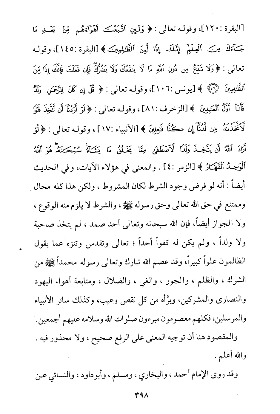 والمعنى في هؤلاء الآيات، وفي الحديث أيضا: أنه لو فرض وجود الشرط لكان المشروط، ولكن هذا كله محال وممتنع في حق الله تعالى وحق رسوله - صلى الله عليه وسلم -، والشرط لا يلزم منه الوقوع ولا الجواز أيضا، فإن الله سبحانه وتعالى أحد صمد، لم يتخذ صاحبة ولا ولدا، ولم يكن له كفوا أحدا، تعالى وتقدس وتنزه عما يقول الظالمون علوا كبيرا، وقد عصم الله تبارك وتعالى رسوله محمدا - صلى الله عليه وسلم - من الشرك والظلم والجور والغي والضلال، ومتابعة أهواء اليهود والنصارى والمشركين، وبرَّأه من كل نقص وعيب، وكذلك سائر الأنبياء والمرسلين، فكلهم معصومون مُبرَّؤون، صلوات الله وسلامه عليهم أجمعين.