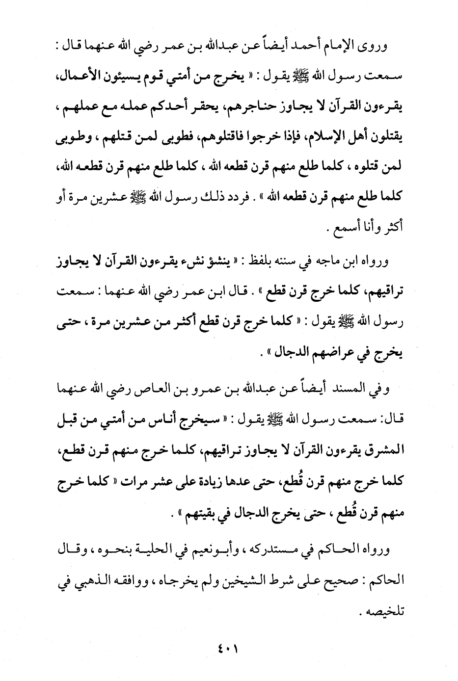 وروى الإمام أحمد أيضا عن عبد الله بن عمر -رضي الله عنهما- قال: سمعت رسول الله - صلى الله عليه وسلم - يقول: «يخرج من أمتي قوم يسيئون الأعمال، يقرؤون القرآن لا يجاوز حناجرهم، يحقر أحدكم عمله مع عملهم، يقتلون أهل الإسلام، فإذا خرجوا فاقتلوهم، فطوبى لمن قتلهم، وطوبى لمن قتلوه، كلما طلع منهم قرن قطعه الله، كلما طلع منهم قرن قطعة الله، كلما طلع منهم قرن قطعة الله» فردد ذلك رسول الله - صلى الله عليه وسلم - عشرين مرة أو أكثر وأنا أسمع.