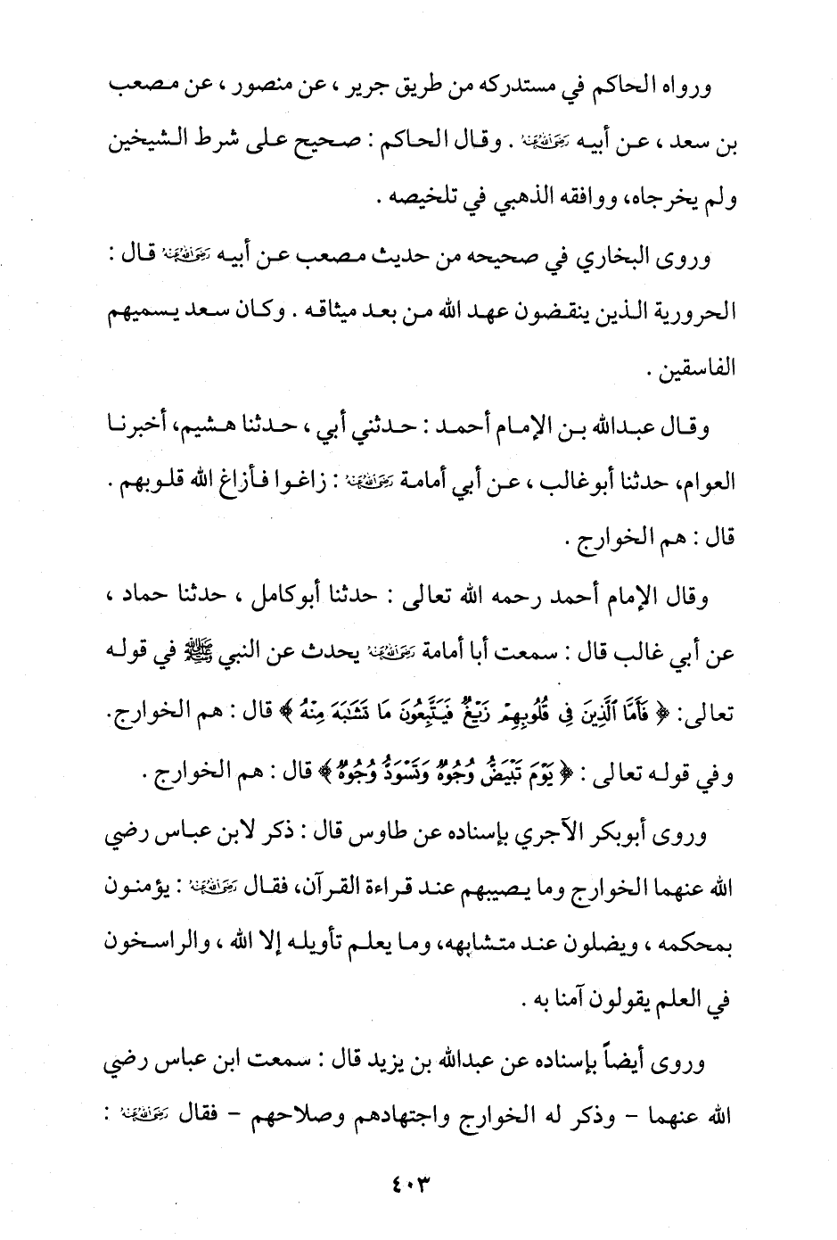 وروى أيضا بإسناده عن عبد الله بن يزيد قال: سمعت ابن عباس -رضي الله عنهما- وذكر له الخوارج واجتهادهم وصلاحهم فقال - رضي الله عنه -: