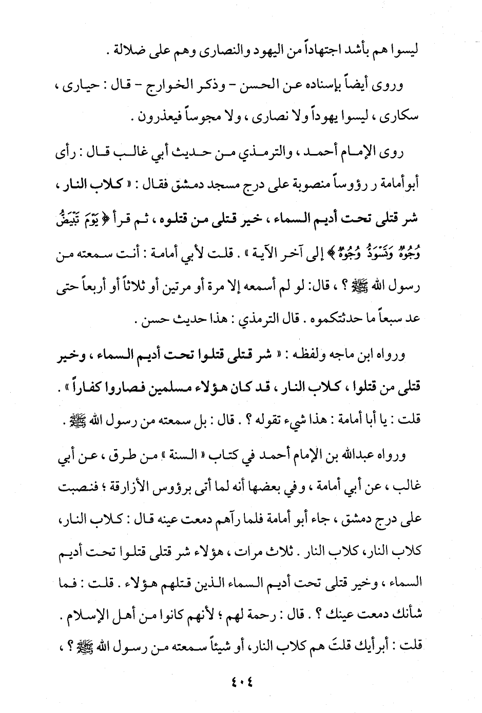 ورواه عبد الله ابن الإمام أحمد في كتاب "السنة" من طرق، عن أبي غالب، عن أبي أمامة، وفي بعضها أنه لما أُتي برؤوس الأزارقة فنصبت على درج دمشق، جاء أبو أمامة فلما رآهم دمعت عينه قال: «كلاب النار، كلاب النار، كلاب النار -ثلاث مرات- هؤلاء شر قتلى قتلوا تحت أديم السماء، وخير قتلى تحت أديم السماء الذين قتلهم هؤلاء» قلت: فما شأنك دمعت عينك؟ قال: رحمة لهم؛ لأنهم كانوا من أهل الإسلام، قلت: أبرأيك قلت هم كلاب النار، أو شيئا سمعته من رسول الله - صلى الله عليه وسلم -؟