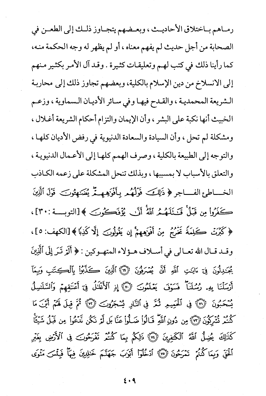 رماهم باختلاق الأحاديث، وبعضهم يتجاوز ذلك إلى الطعن في الصحابة من أجل حديث لم يفهم معناه، أو لم يظهر له وجه الحكمة منه، كما رأينا ذلك في كتب لهم وتعليقات كثيرة، وقد آل الأمر بكثير منهم إلى الانسلاخ من دين الإسلام بالكلية، وبعضهم تجاوز ذلك إلى محاربة الشريعة المحمدية والقدح فيها وفي سائر الأديان السماوية، وزعم الخبيث أنها نكبة على البشر، وأن الإيمان والتزام أحكام الشريعة أغلال، ومشكلة لم تحل، وأن السيادة والسعادة الدنيوية في رفض الأديان كلها، والتوجه إلى الطبيعة بالكلية، وصرف الهمم كلها إلى الأعمال الدنيوية، والتعلق بالأسباب لا بمسببها، وبذلك تَنْحلُّ المشكلة على زعمه الكاذب الخاطئ الفاجر، {ذَلِكَ قَوْلُهُمْ بِأَفْوَاهِهِمْ يُضَاهِئُونَ قَوْلَ الَّذِينَ كَفَرُوا مِنْ قَبْلُ قَاتَلَهُمُ اللَّهُ أَنَّى يُؤْفَكُونَ} [التوبة: 30]، {كَبُرَتْ كَلِمَةً تَخْرُجُ مِنْ أَفْوَاهِهِمْ إِنْ يَقُولُونَ إِلَّا كَذِبًا} [الكهف: 5]، وقد قال الله تعالى في أسلاف هؤلاء المتهوكين: {أَلَمْ تَرَ إِلَى الَّذِينَ يُجَادِلُونَ فِي آَيَاتِ اللَّهِ أَنَّى يُصْرَفُونَ * الَّذِينَ كَذَّبُوا بِالْكِتَابِ وَبِمَا أَرْسَلْنَا بِهِ رُسُلَنَا فَسَوْفَ يَعْلَمُونَ * إِذِ الْأَغْلَالُ فِي أَعْنَاقِهِمْ وَالسَّلَاسِلُ يُسْحَبُونَ * فِي الْحَمِيمِ ثُمَّ فِي النَّارِ يُسْجَرُونَ * ثُمَّ قِيلَ لَهُمْ أَيْنَ مَا كُنْتُمْ تُشْرِكُونَ * مِنْ دُونِ اللَّهِ قَالُوا ضَلُّوا عَنَّا بَلْ لَمْ نَكُنْ نَدْعُو مِنْ قَبْلُ شَيْئًا كَذَلِكَ يُضِلُّ اللَّهُ الْكَافِرِينَ * ذَلِكُمْ بِمَا كُنْتُمْ تَفْرَحُونَ فِي الْأَرْضِ بِغَيْرِ الْحَقِّ وَبِمَا كُنْتُمْ تَمْرَحُونَ * ادْخُلُوا أَبْوَابَ جَهَنَّمَ خَالِدِينَ فِيهَا فَبِئْسَ مَثْوَى