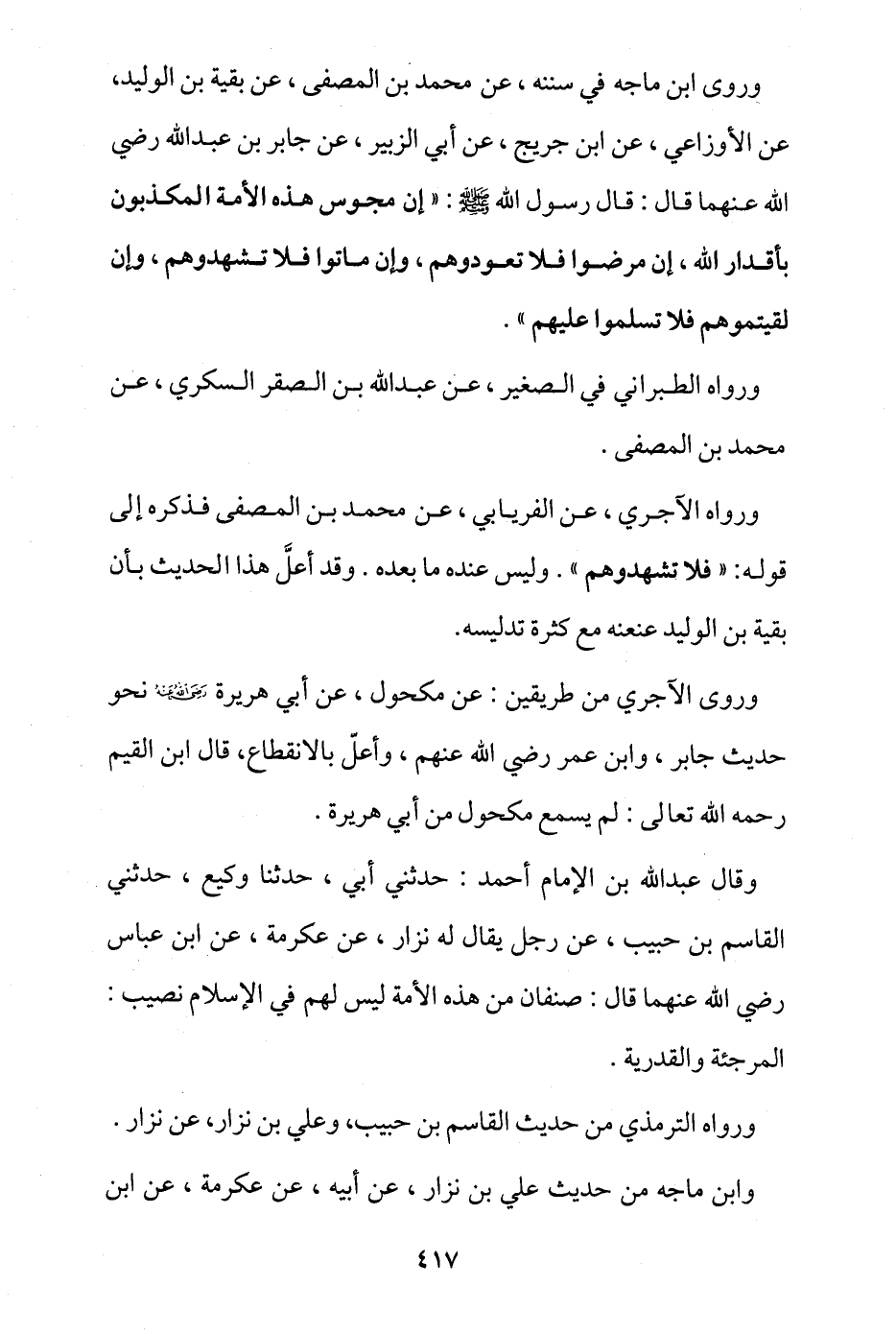 وروى ابن ماجة في سننه، عن محمد بن المصفى، عن بقية بن الوليد، عن الأوزاعي، عن ابن جريج، عن أبي الزبير، عن جابر بن عبد الله -رضي الله عنهما- قال: قال رسول الله - صلى الله عليه وسلم -: «إن مجوس هذه الأمة المكذبون بأقدار الله، إن مرضوا فلا تعودوهم، وإن ماتوا فلا تشهدوهم، وإن لقيتموهم فلا تسلموا عليهم».