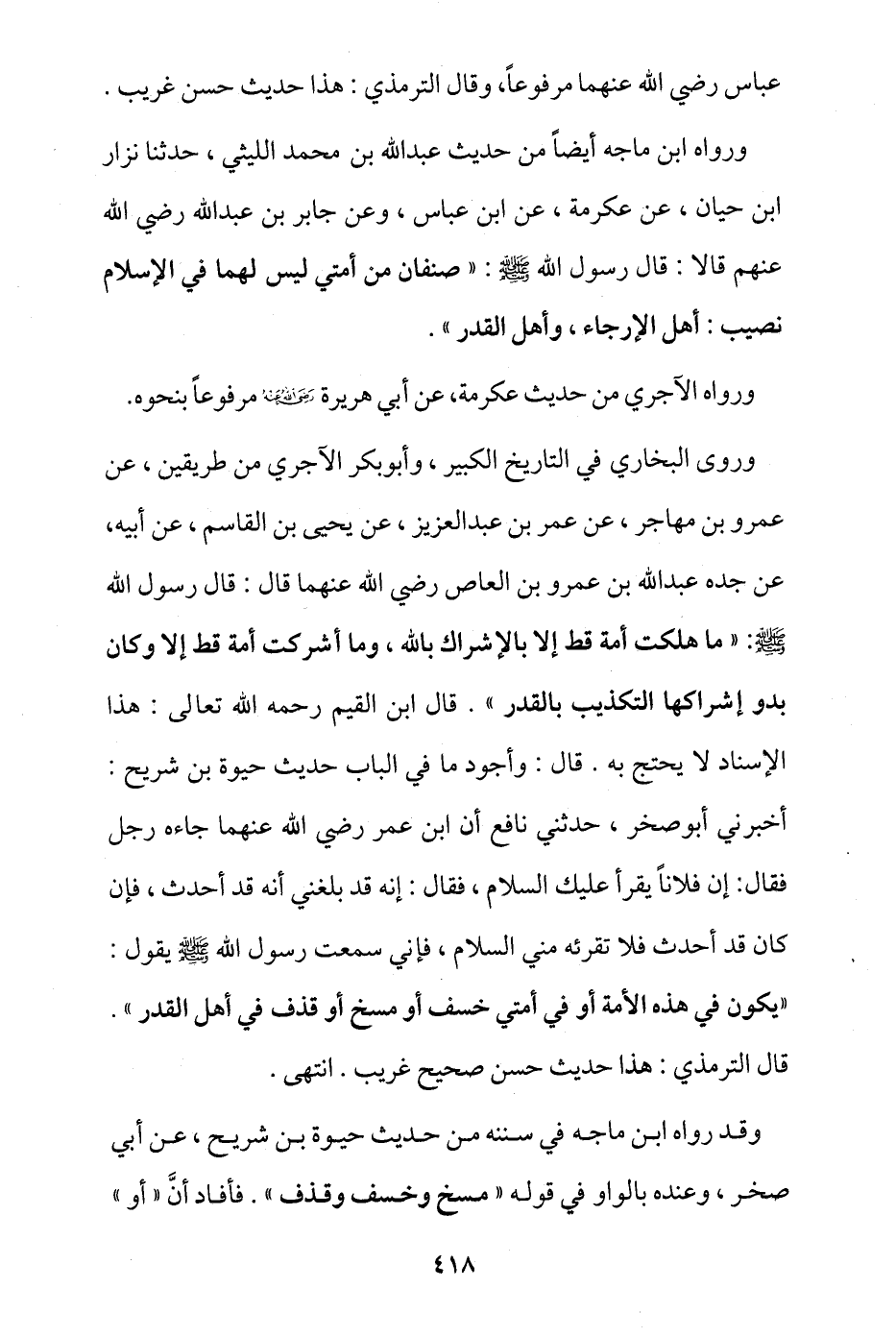 وروى البخاري في "التاريخ الكبير"، وأبو بكر الآجري من طريقين؛ عن عمرو بن مهاجر، عن عمر بن عبد العزيز، عن يحيى بن القاسم، عن أبيه، عن جده عبد الله بن عمرو بن العاص -رضي الله عنهما- قال: قال رسول الله - صلى الله عليه وسلم -: «ما هلكت أمة قط إلا بالإشراك بالله، وما أشركت أمة قط إلا وكان بدو إشراكها التكذيب بالقدر» قال ابن القيم رحمه الله تعالى: هذا الإسناد لا يحتج به، قال: وأجود ما في الباب حديث حيوة بن شريح: أخبرني أبو صخر، حدثني نافع أن ابن عمر -رضي الله عنهما- جاءه رجل فقال: إن فلانا يقرأ عليك السلام، فقال: إنه قد بلغني أنه قد أحدث، فإن كان قد أحدث فلا تقرئه مني السلام، فإني سمعت رسول الله - صلى الله عليه وسلم - يقول: «يكون في هذه الأمة أو في أمتي خسف أو مسخ أو قذف في أهل القدر» قال الترمذي: هذا حديث حسن صحيح غريب. انتهى.