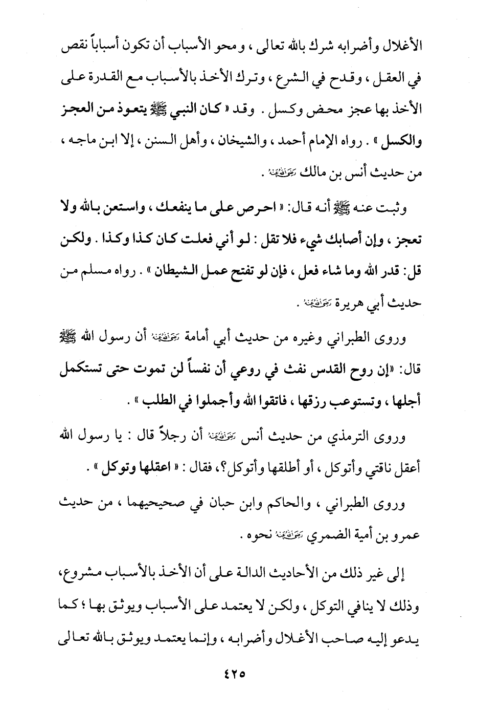 الأغلال وأضرابه شرك بالله تعالى، ومحو الأسباب أن تكون أسبابا نقص في العقل، وقدح في الشرع، وترك الأخذ بالأسباب مع القدرة على الأخذ بها عجز محض وكسل، وقد «كان النبي - صلى الله عليه وسلم - يتعوذ من العجز والكسل» رواه الإمام أحمد، والشيخان، وأهل السنن إلا ابن ماجة، من حديث أنس بن مالك - رضي الله عنه -.