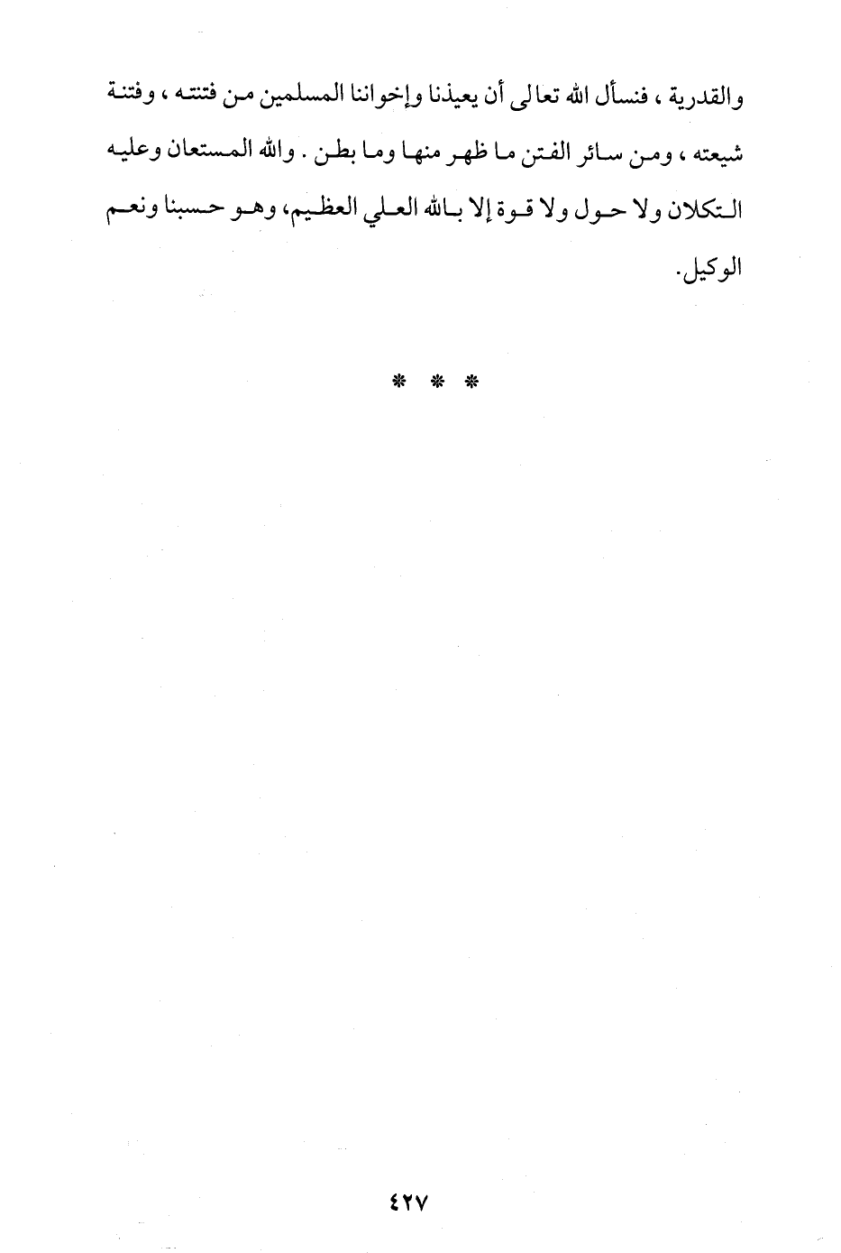 والقدرية، فنسأل الله تعالى أن يعيذنا وإخواننا المسلمين من فتنته، وفتنة شيعته، ومن سائر الفتن ما ظهر منها وما بطن، والله المستعان، وعليه التكلان، ولا حول ولا قوة إلا بالله العلي العظيم، وهو حسبنا ونعم الوكيل.