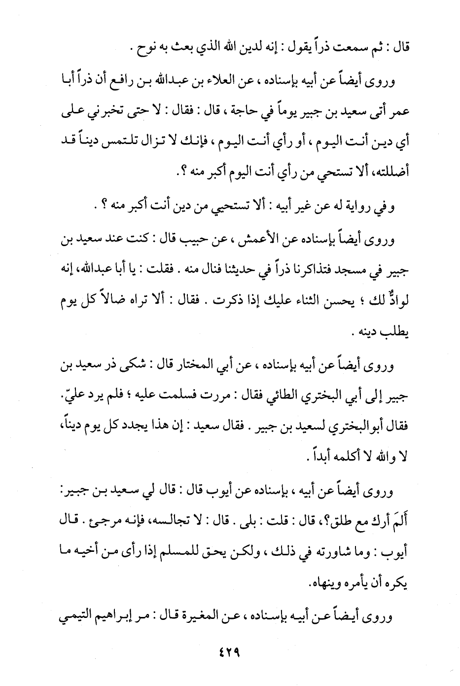 وروى أيضا عن أبيه بإسناده، عن العلاء بن عبد الله بن رافع، أن ذرا أبا عمر أتى سعيد بن جبير يوما في حاجة، قال: فقال: لا، حتى تخبرني على أي دين أنت اليوم، أو رأي أنت اليوم، فإنك لا تزال تلتمس دينا قد أضللته، ألا تستحي من رأي أنت اليوم أكبر منه؟