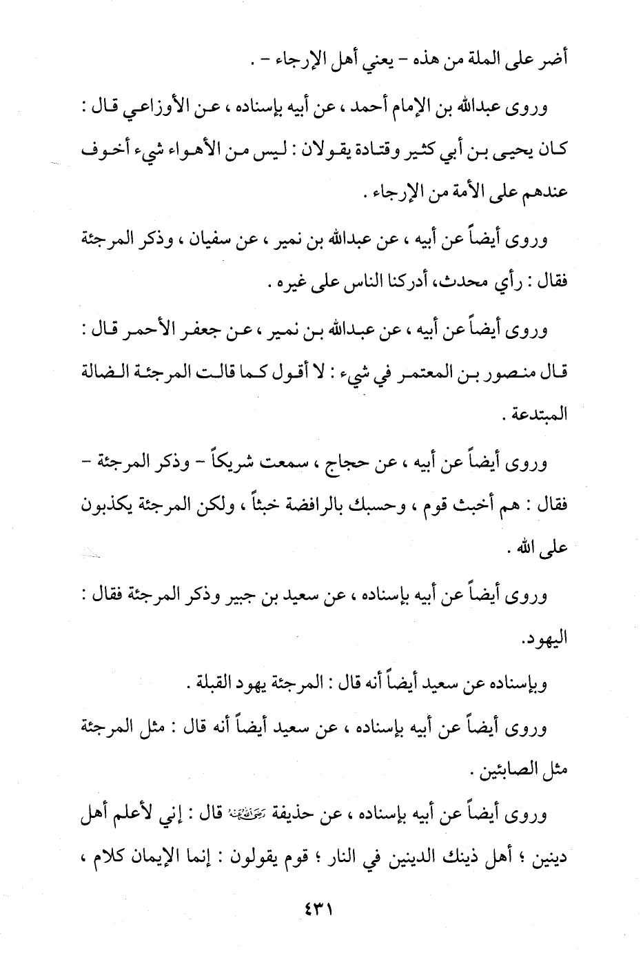 وروى أيضا عن أبيه، عن عبد الله بن نمير، عن جعفر الأحمر قال: قال منصور بن المعتمر في شيء: لا أقول كما قالت المرجئة الضالة المبتدعة.
