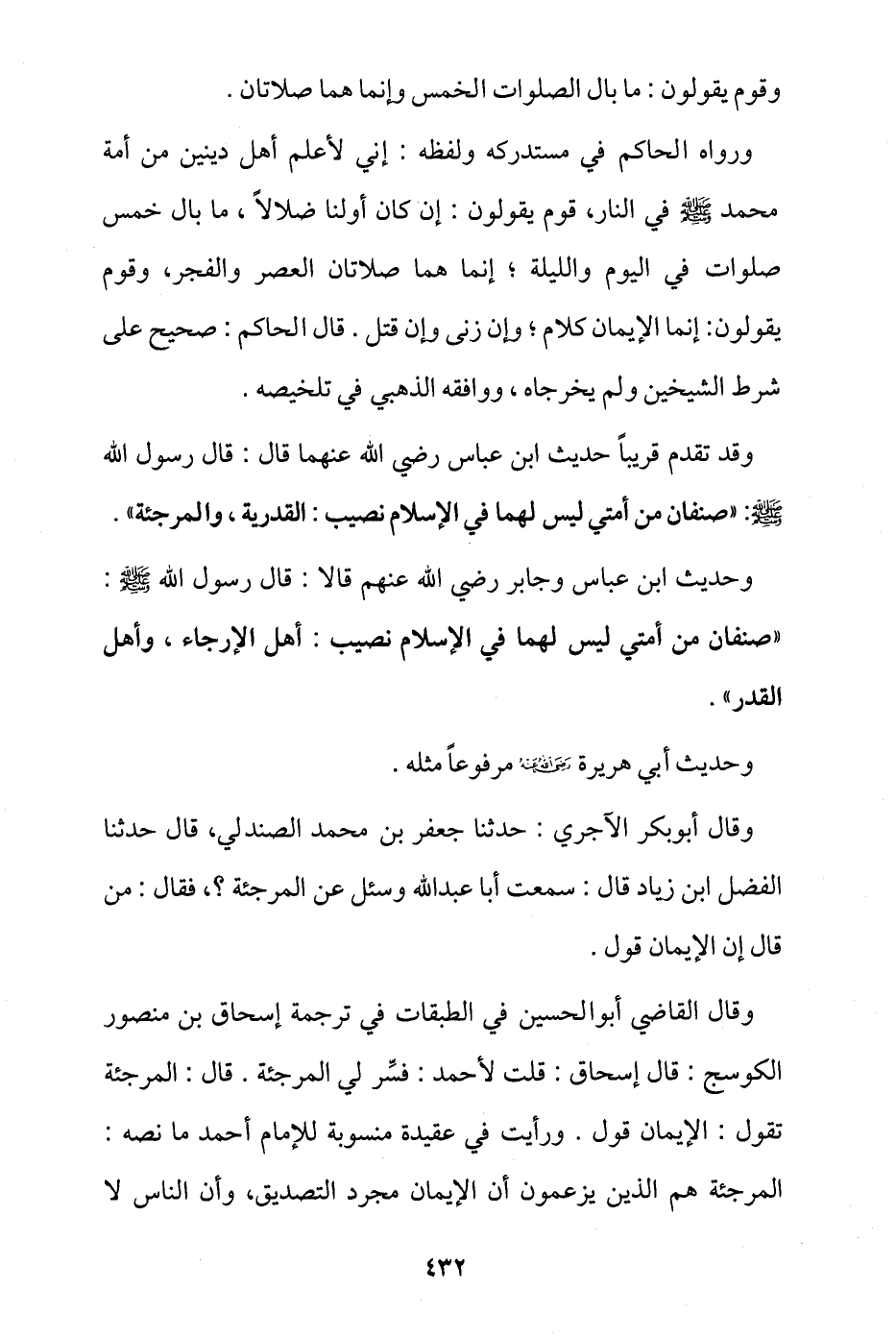 ورواه الحاكم في مستدركه ولفظه: إني لأعلم أهل دينين من أمة محمد - صلى الله عليه وسلم - في النار؛ قوم يقولون: إن كان أولنا ضلالا، ما بال خمس صلوات في اليوم والليلة، إنما هما صلاتان العصر والفجر، وقوم يقولون: إنما الإيمان كلام، وإن زنى وإن قتل. قال الحاكم: صحيح على شرط الشيخين ولم يخرجاه، ووافقه الذهبي في تلخيصه.