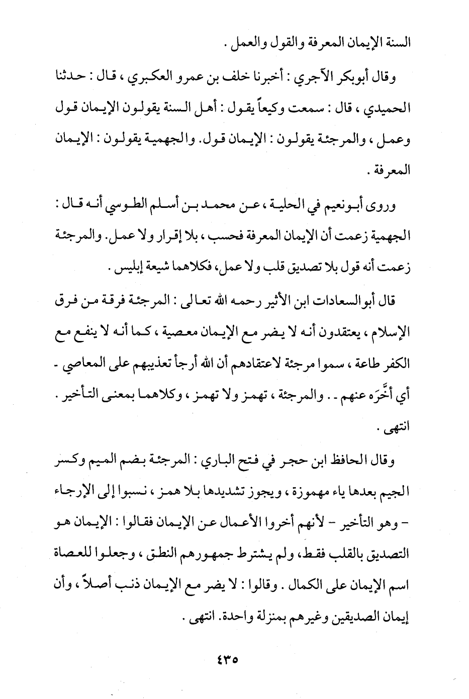 وقال أبو بكر الآجري: أخبرنا خلف بن عمرو العكبري قال: حدثنا الحميدي قال: سمعت وكيعا يقول: أهل السنة يقولون الإيمان قول وعمل، والمرجئة يقولون: الإيمان قول، والجهمية يقولون: الإيمان المعرفة.