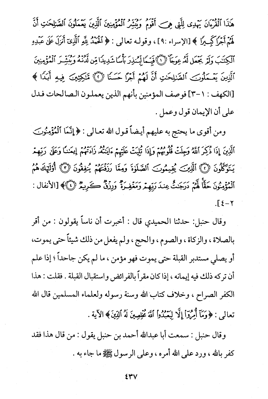 هَذَا الْقُرْآَنَ يَهْدِي لِلَّتِي هِيَ أَقْوَمُ وَيُبَشِّرُ الْمُؤْمِنِينَ الَّذِينَ يَعْمَلُونَ الصَّالِحَاتِ أَنَّ لَهُمْ أَجْرًا كَبِيرًا} [الإسراء: 9]، وقوله تعالى: {الْحَمْدُ لِلَّهِ الَّذِي أَنْزَلَ عَلَى عَبْدِهِ الْكِتَابَ وَلَمْ يَجْعَلْ لَهُ عِوَجًا * قَيِّمًا لِيُنْذِرَ بَاسًا شَدِيدًا مِنْ لَدُنْهُ وَيُبَشِّرَ الْمُؤْمِنِينَ الَّذِينَ يَعْمَلُونَ الصَّالِحَاتِ أَنَّ لَهُمْ أَجْرًا حَسَنًا * مَاكِثِينَ فِيهِ أَبَدًا} [الكهف: 1 - 3]؛ فوصف المؤمنين بأنهم الذين يعملون الصالحات فدل على أن الإيمان قول وعمل.