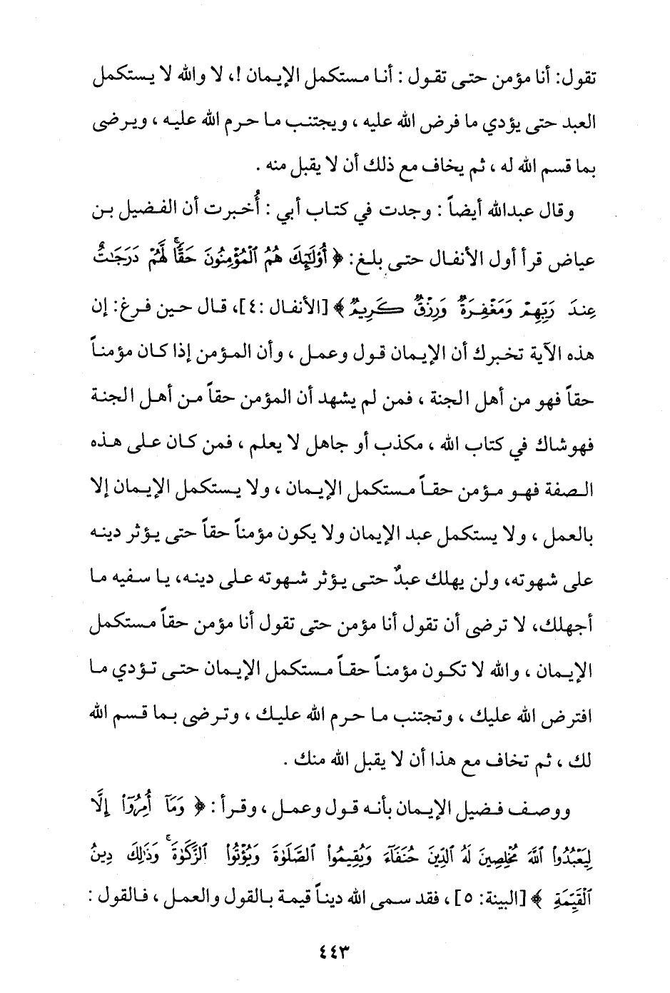 وقال عبد الله أيضا: وجدت في كتاب أبي: أُخبرت أن الفضيل بن عياض قرأ أول الأنفال حتى بلغ: {أُولَئِكَ هُمُ الْمُؤْمِنُونَ حَقًّا لَهُمْ دَرَجَاتٌ عِنْدَ رَبِّهِمْ وَمَغْفِرَةٌ وَرِزْقٌ كَرِيمٌ} [الأنفال: 4]، قال حين فرغ: إن هذه الآية تخبرك أن الإيمان قول وعمل، وأن المؤمن إذا كان مؤمنا حقا فهو من أهل الجنة، فمن لم يشهد أن المؤمن حقا من أهل الجنة فهو شاك في كتاب الله، مكذب أو جاهل لا يعلم، فمن كان على هذه الصفة فهو مؤمن حقا مستكمل الإيمان، ولا يستكمل الإيمان إلا بالعمل، ولا يستكمل عبد الإيمان ولا يكون مؤمنا حقا حتى يؤثر دينه على شهوته، ولن يهلك عبدٌ حتى يؤثر شهوته على دينه، يا سفيه ما أجهلك، لا ترضى أن تقول أنا مؤمن حتى تقول أنا مؤمن حقا مستكمل الإيمان، والله لا تكون مؤمنا حقا مستكمل الإيمان حتى تؤدي ما افترض الله عليك، وتجتنب ما حرم الله عليك، وترضى بما قسم الله لك، ثم تخاف مع هذا أن لا يقبل الله منك.