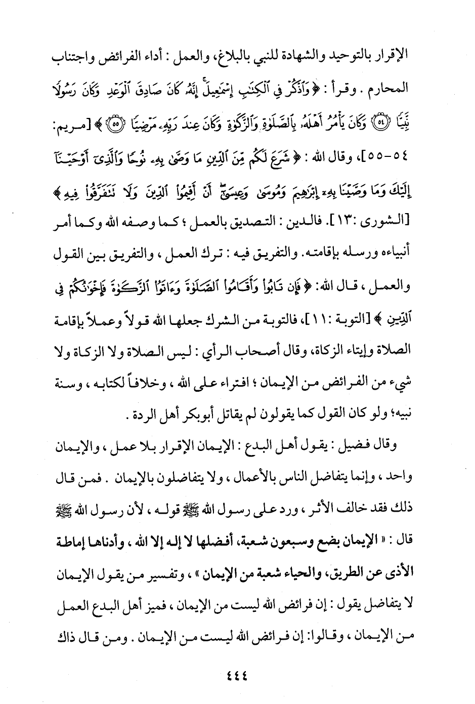 الإقرار بالتوحيد والشهادة للنبي بالبلاغ، والعمل: أداء الفرائض واجتناب المحارم، وقرأ: {وَاذْكُرْ فِي الْكِتَابِ إِسْمَاعِيلَ إِنَّهُ كَانَ صَادِقَ الْوَعْدِ وَكَانَ رَسُولًا نَبِيًّا * وَكَانَ يَامُرُ أَهْلَهُ بِالصَّلَاةِ وَالزَّكَاةِ وَكَانَ عِنْدَ رَبِّهِ مَرْضِيًّا} [مريم: 54 - 55]، وقال الله: {شَرَعَ لَكُمْ مِنَ الدِّينِ مَا وَصَّى بِهِ نُوحًا وَالَّذِي أَوْحَيْنَا إِلَيْكَ وَمَا وَصَّيْنَا بِهِ إِبْرَاهِيمَ وَمُوسَى وَعِيسَى أَنْ أَقِيمُوا الدِّينَ وَلَا تَتَفَرَّقُوا فِيهِ} [الشورى: 13]، فالدين: التصديق بالعمل كما وصفه الله وكما أمر أنبياءه ورسله بإقامته، والتفريق فيه: ترك العمل والتفريق بين القول والعمل، قال الله: {فَإِنْ تَابُوا وَأَقَامُوا الصَّلَاةَ وَآَتَوُا الزَّكَاةَ فَإِخْوَانُكُمْ فِي الدِّينِ} [التوبة: 11]، فالتوبة من الشرك جعلها الله قولا وعملا بإقامة الصلاة وإيتاء الزكاة، وقال أصحاب الرأي: ليس الصلاة ولا الزكاة ولا شيء من الفرائض من الإيمان؛ افتراء على الله، وخلافا لكتابه، وسنة نبيه، ولو كان القول كما يقولون لم يقاتل أبو بكر أهل الردة.