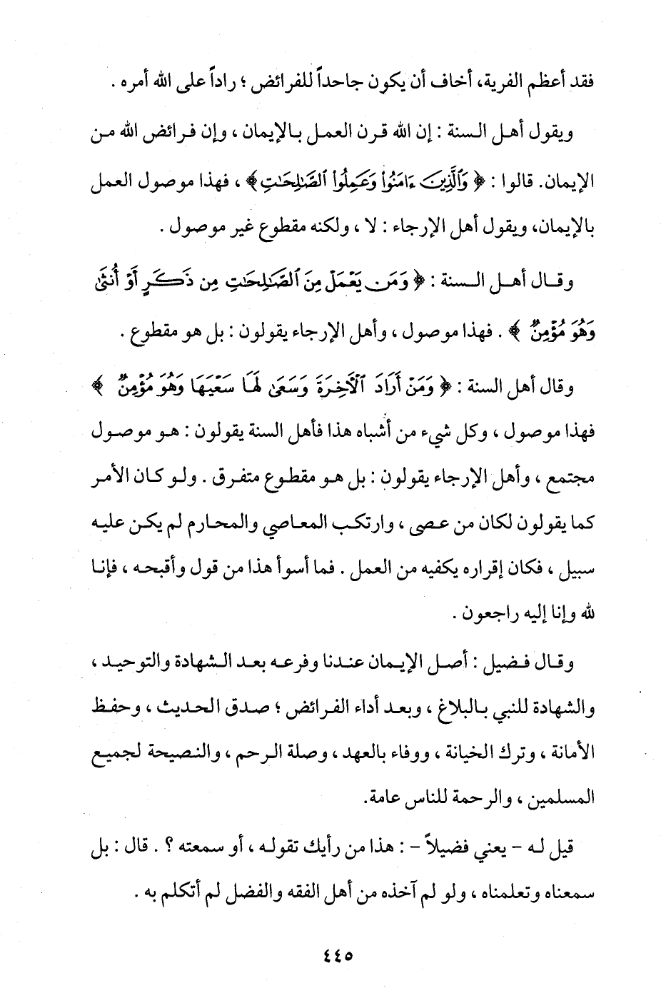 ويقول أهل السنة: إن الله قرن العمل بالإيمان، وإن فرائض الله من الإيمان، قالوا: {وَالَّذِينَ آَمَنُوا وَعَمِلُوا الصَّالِحَاتِ} فهذا موصول العمل بالإيمان، ويقول أهل الإرجاء: لا، ولكنه مقطوع غير موصول.