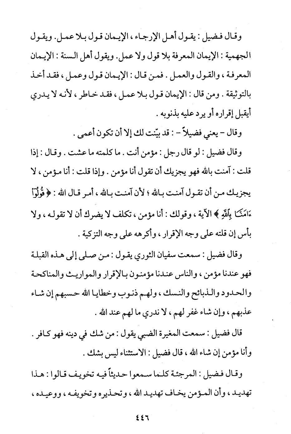 وقال فضيل: يقول أهل الإرجاء: الإيمان قول بلا عمل، ويقول الجهمية: الإيمان المعرفة بلا قول ولا عمل، ويقول أهل السنة: الإيمان المعرفة والقول والعمل؛ فمن قال: الإيمان قول وعمل، فقد أخذ بالتوثيقة، ومن قال: الإيمان قول بلا عمل فقد خاطر؛ لأنه لا يدري أيقبل إقراره أو يرد عليه بذنوبه.