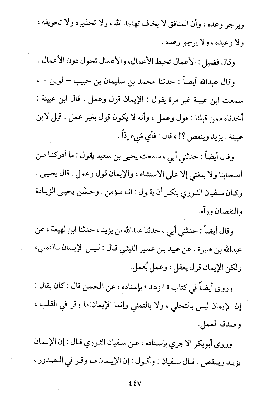 وقال عبد الله أيضا: حدثنا محمد بن سليمان بن حبيب -لوين- سمعت ابن عيينة غير مرة يقول: الإيمان قول وعمل، قال ابن عيينة: أخذناه ممن قبلنا: قول وعمل، وأنه لا يكون قول بغير عمل، قيل لابن عيينة: يزيد وينقص؟! قال: فأي شيء إذًا.