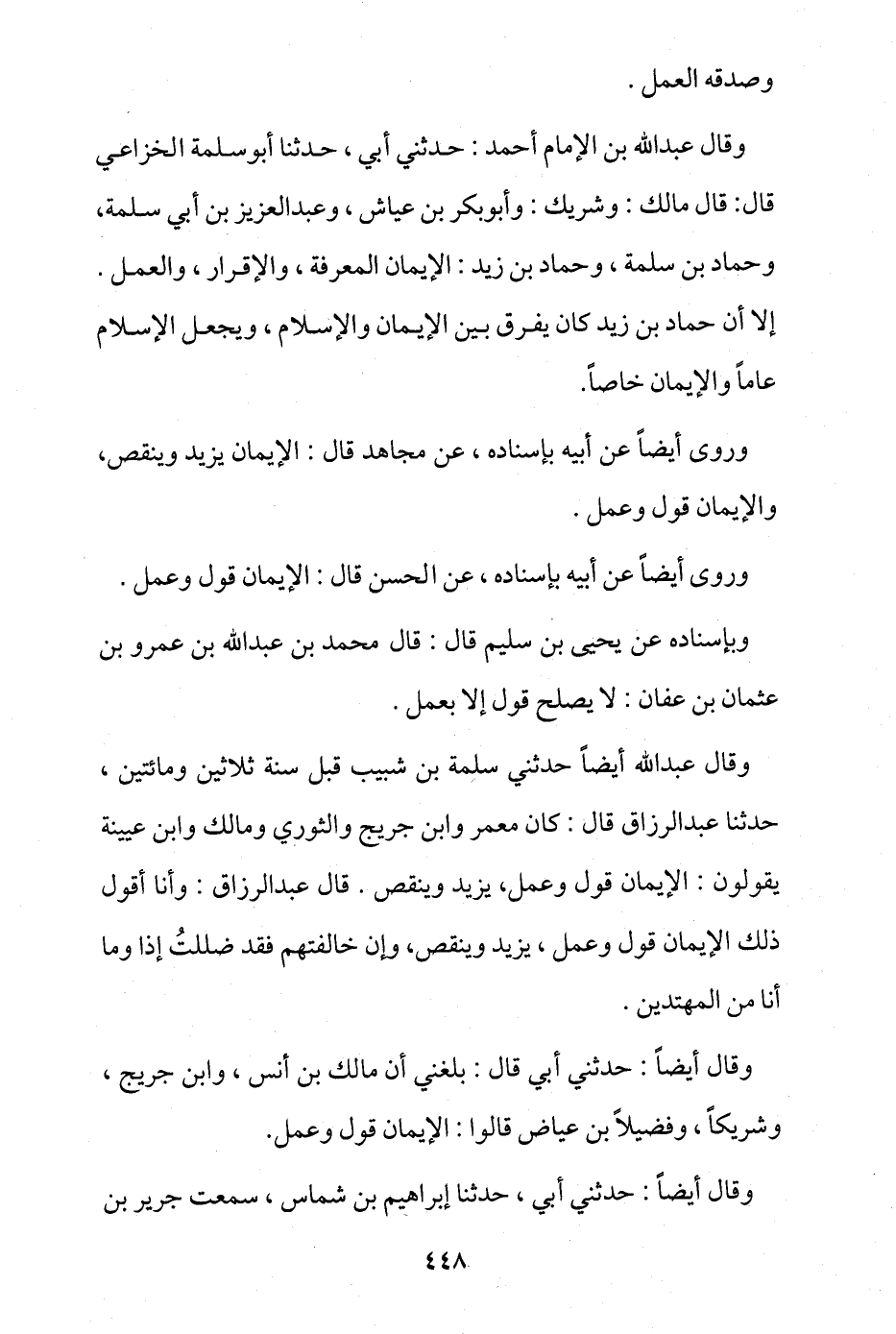 وقال عبد الله ابن الإمام أحمد: حدثني أبي، حدثنا أبو سلمة الخزاعي قال: قال مالك، وشريك، وأبو بكر بن عياش، وعبد العزيز بن أبي سلمة، وحماد بن سلمة، وحماد بن زيد: الإيمان؛ المعرفة والإقرار والعمل، إلا أن حماد بن زيد كان يفرق بين الإيمان والإسلام، ويجعل الإسلام عاما والإيمان خاصا.
