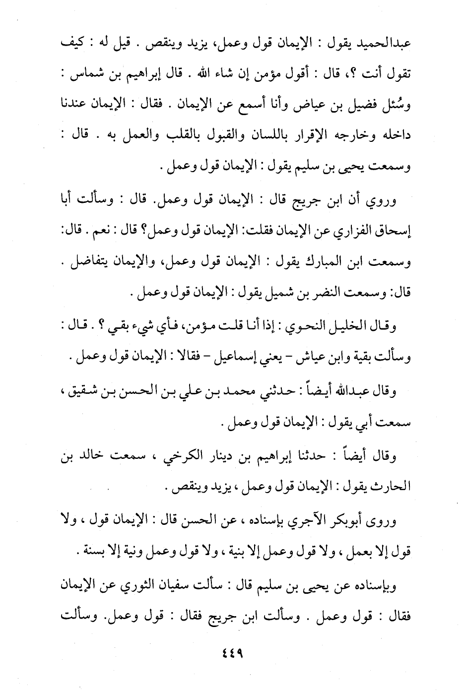 وروي أن ابن جريج قال: الإيمان قول وعمل، قال: وسألت أبا إسحاق الفزاري عن الإيمان فقلت: الإيمان قول وعمل؟ قال: نعم، قال: وسمعت ابن المبارك يقول: الإيمان قول وعمل، والإيمان يتفاضل، قال: وسمعت النضر بن شميل يقول: الإيمان قول وعمل.