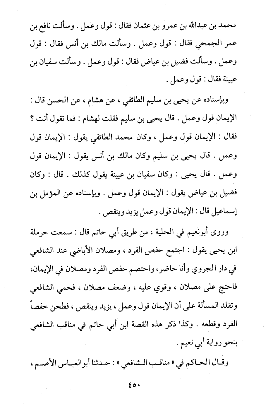 محمد بن عبد الله بن عمرو بن عثمان فقال: قول وعمل، وسألت نافع بن عمر الجمحي فقال: قول وعمل، وسألت مالك بن أنس فقال: قول وعمل، وسألت فضيل بن عياض فقال: قول وعمل، وسألت سفيان بن عيينة فقال: قول وعمل.