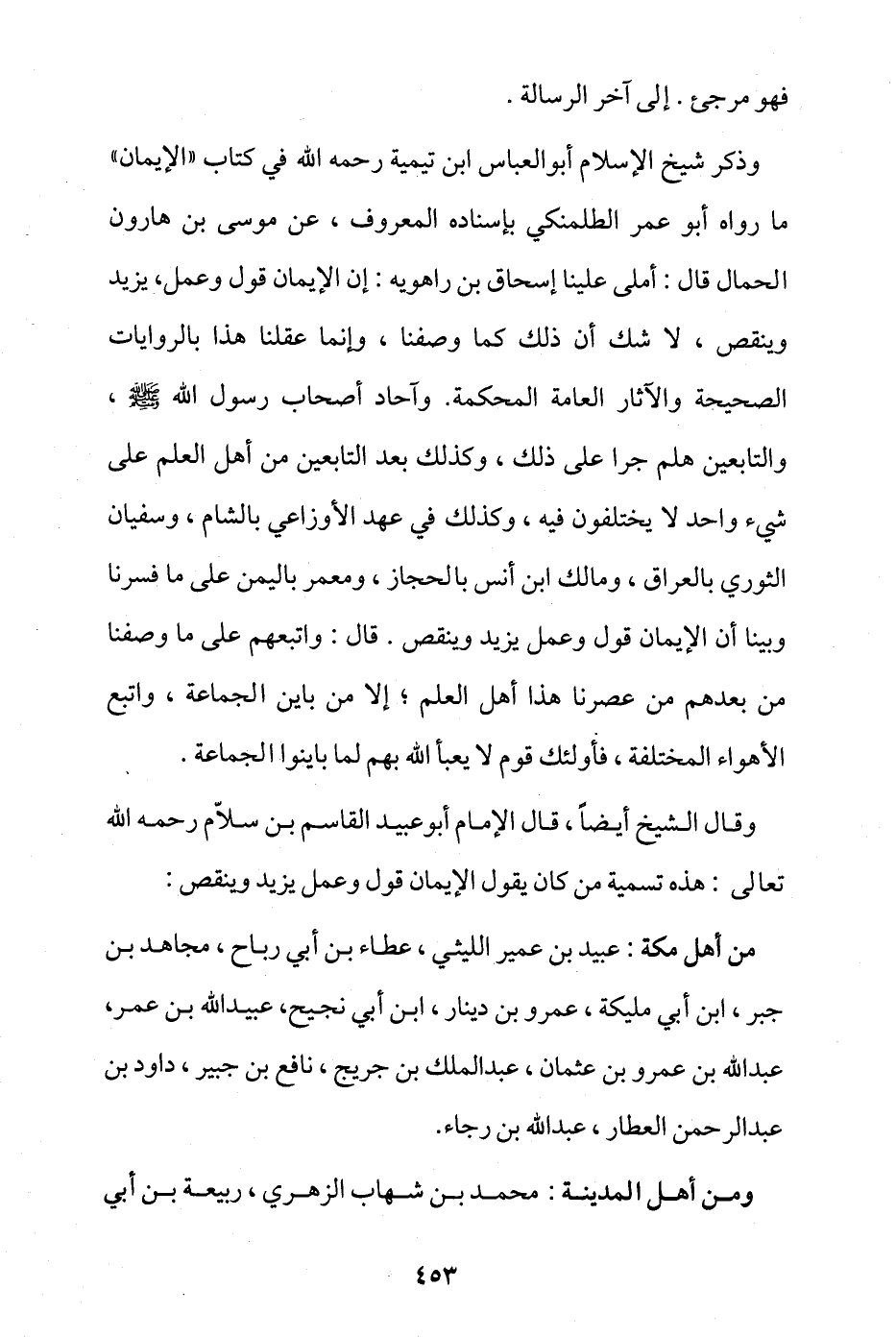 وذكر شيخ الإسلام أبو العباس ابن تيمية رحمه الله في كتاب "الإيمان" ما رواه أبو عمر الطلمنكي بإسناده المعروف، عن موسى بن هارون الحمال قال: أملى علينا إسحاق بن راهويه: إن الإيمان قول وعمل، يزيد وينقص، لا شك أن ذلك كما وصفنا، وإنما عقلنا هذا بالروايات الصحيحة والآثار العامة المحكمة، وآحاد أصحاب رسول الله - صلى الله عليه وسلم -، والتابعين هلم جرا على ذلك، وكذلك بعد التابعين من أهل العلم على شيء واحد لا يختلفون فيه، وكذلك في عهد الأوزاعي بالشام، وسفيان الثوري بالعراق، ومالك بن أنس بالحجاز، ومعمر باليمن على ما فسرنا وبينا أن الإيمان قول وعمل يزيد وينقص، قال: واتبعهم على ما وصفنا من بعدهم من عصرنا هذا أهل العلم إلا من باين الجماعة، واتبع الأهواء المختلفة، فأولئك قوم لا يعبأ الله بهم لما باينوا الجماعة.