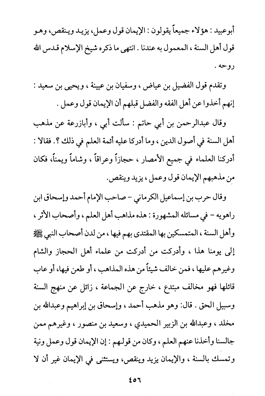 أبو عبيد: هؤلاء جميلا يقولون: الإيمان قول وعمل، يزيد وينقص، وهو قول أهل السنة، المعمول به عندنا. انتهى ما ذكره شيخ الإسلام قدس الله روحه.