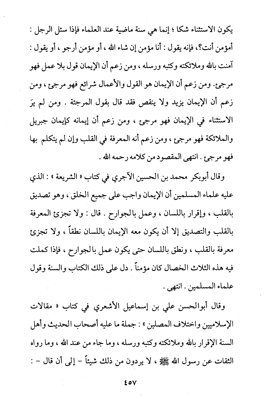 يكون الاستثناء شكا؛ إنما هي سنة ماضية عند العلماء، فإذا سئل الرجل: أمؤمن أنت؟ فإنه يقول: أنا مؤمن إن شاء الله، أو مؤمن أرجو، أو يقول: آمنت بالله وملائكته وكتبه ورسله، ومن زعم أن الإيمان قول بلا عمل فهو مرجئ، ومن زعم أن الإيمان هو القول، والأعمال شرائع فهو مرجئ، ومن زعم أن الإيمان يزيد ولا ينقص فقد قال بقول المرجئة، ومن لم يرَ الاستثناء في الإيمان فهو مرجئ، ومن زعم أن إيمانه كإيمان جبريل والملائكة فهو مرجئ، ومن زعم أنه المعرفة في القلب وإن لم يتكلم بها فهو مرجئ. انتهى المقصود من كلامه رحمه الله.