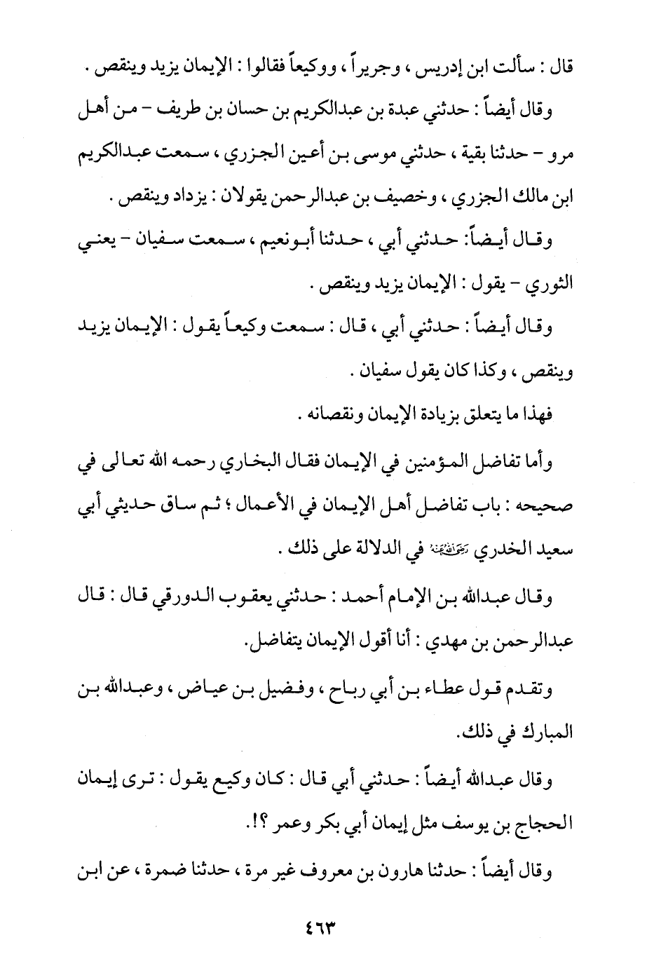 وقال عبد الله ابن الإمام أحمد: حدثني يعقوب الدورقي قال: قال عبد الرحمن بن مهدي: أنا أقول الإيمان يتفاضل.