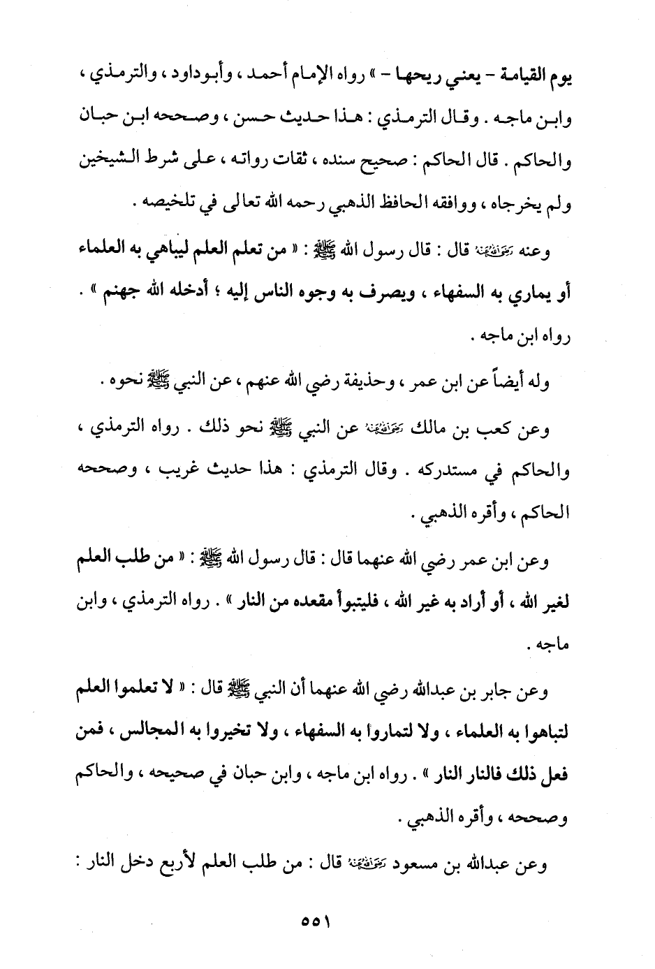 وعنه - رضي الله عنه - قال: قال رسول الله - صلى الله عليه وسلم -: «من تعلَّم العلم ليباهي به العلماء أو يماري به السفهاء، ويصرف به وجوه الناس إليه، أدخله الله جهنم» رواه ابن ماجة.