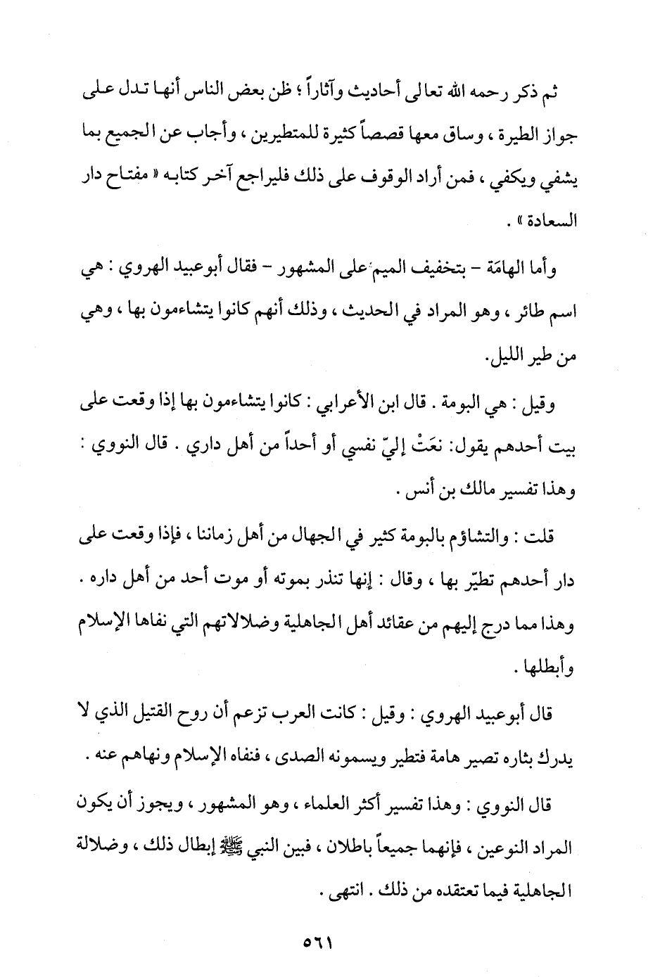 وأما الهامة -بتخفيف الميم على المشهور- فقال أبو عبيد الهروي: هي أسم طائر، وهو المراد في الحديث، وذلك أنهم كانوا يتشاءمون بها، وهي من طير الليل.
