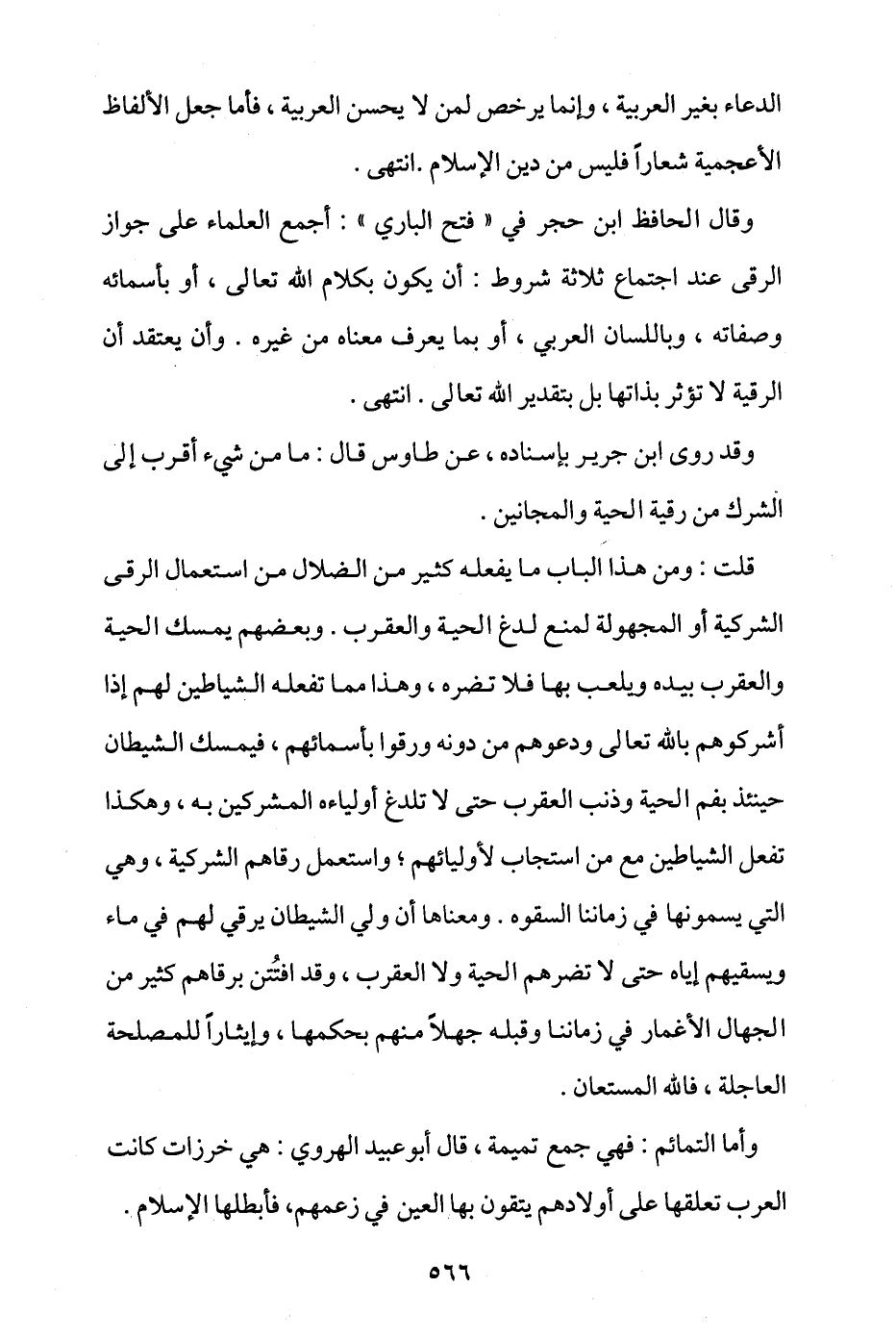 وقال الحافظ ابن حجر في (فتح الباري): أجمع العلماء على جواز الرقى عند اجتماع ثلاثة شروط: أن يكون بكلام الله تعالى، أو بأسمائه وصفاته، وباللسان العربي، أو بما يعرف معناه من غيره، وأن يعتقد أن الرقية لا تؤثر بذاتها بل بتقدير الله تعالى. انتهى.