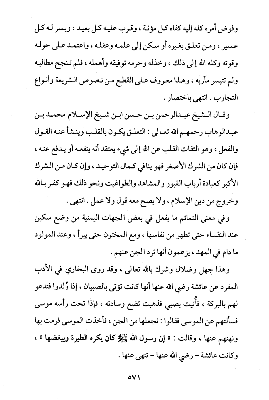 وقال الشيخ عبد الرحمن بن حسن ابن شيخ الإسلام محمد بن عبد الوهاب رحمهم الله تعالى: التعلق يكون بالقلب وينشأ عنه القول والفعل، وهو التفات القلب عن الله إلى شيء يعتقد أنه ينفعه أو يدفع عنه، فإن كان من الشرك الأصغر فهو ينافي كمال التوحيد، وإن كان من الشرك الأكبر كعبادة أرباب القبور والمشاهد والطواغيت ونحو ذلك فهو كفر بالله وخروج من دين الإسلام، ولا يصح معه قول ولا عمل. انتهى.