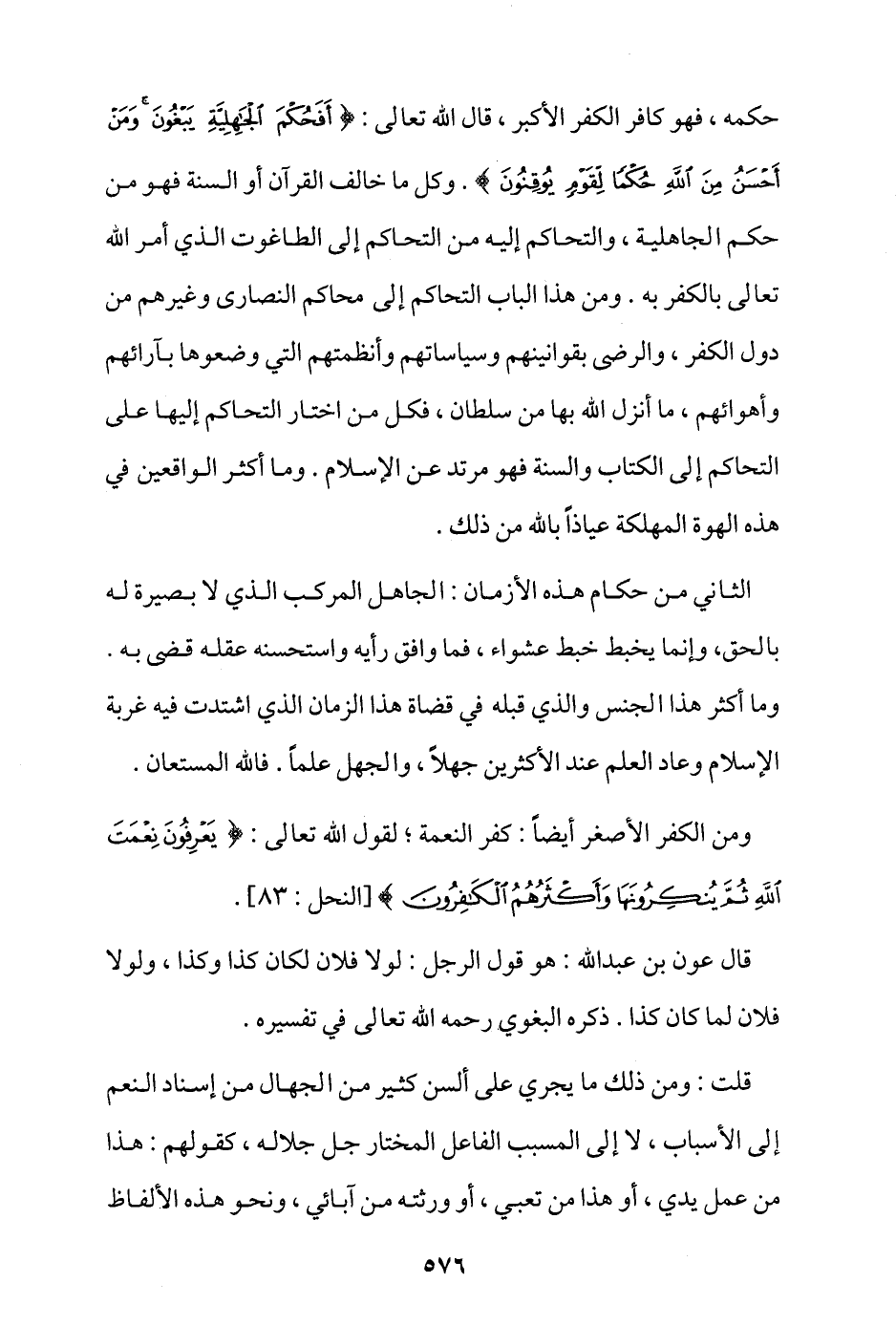 قلت: ومن ذلك ما يجري على ألسن كثير من الجُهَّال من إسناد النعم إلى الأسباب، لا إلى المسبب الفاعل المختار جل جلاله، كقولهم: هذا من عمل يدي، أو هذا من تعبي، أو ورثته من آبائي، ونحو هذه الألفاظ